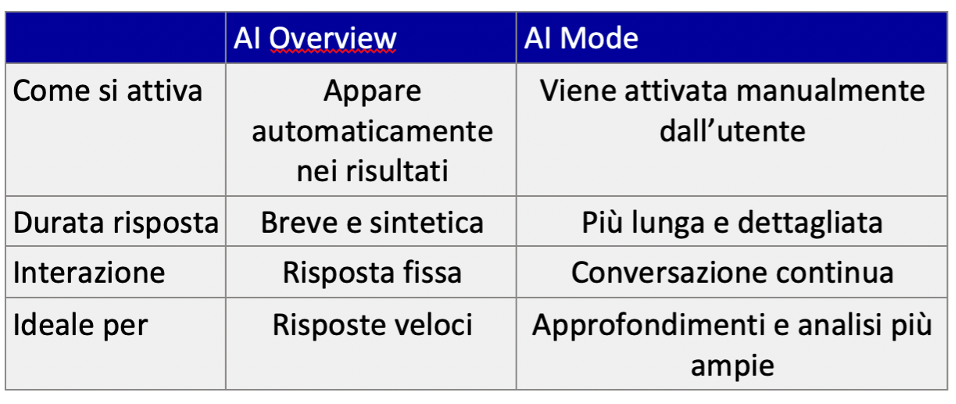 È piuttosto comune confondersi tra AI Mode e AI Overviews. Vediamo in cosa si differenziano: AI Overviews appare automaticamente nella pagina dei risultati di ricerca tradizionale per determinate query; si presenta come un riquadro sintetico sopra i link organici, contenente una risposta breve generata dall'IA con citazioni, seguita dai classici risultati web.