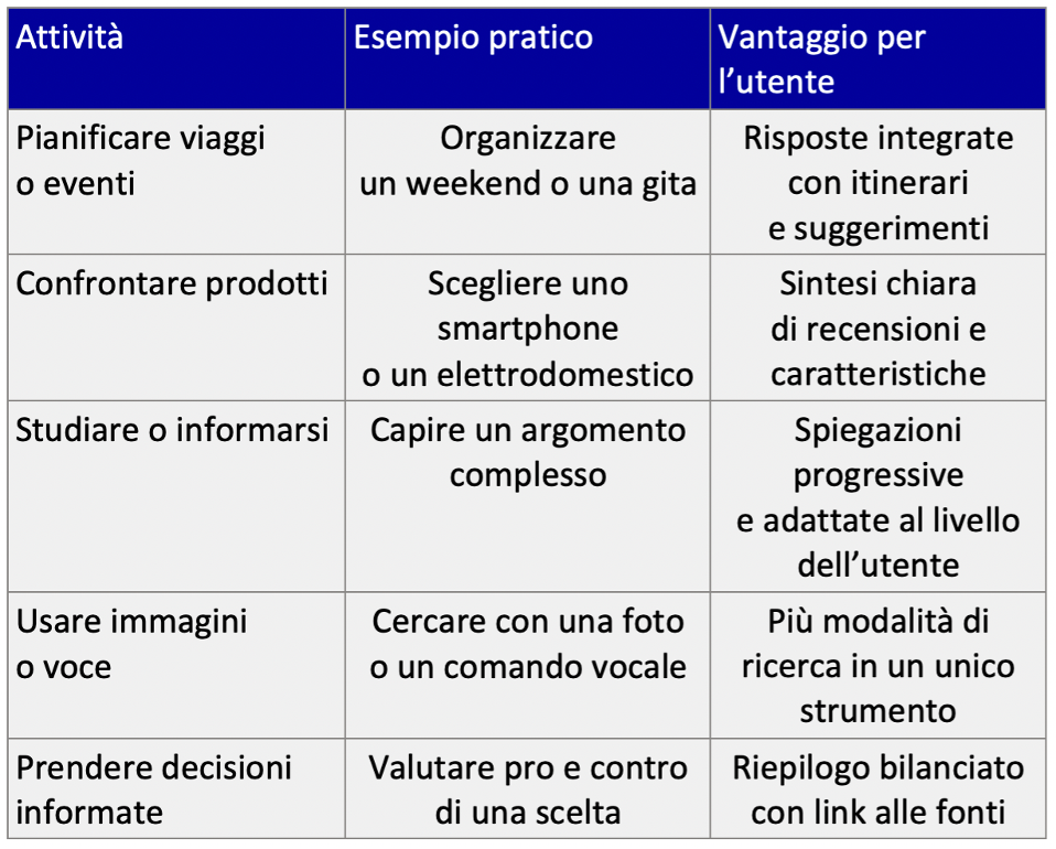 Nella tabella sottostante abbiamo riportato alcuni casi in cui usare Google AI Mode al posto della ricerca tradizionale può offrire risultati più utili.