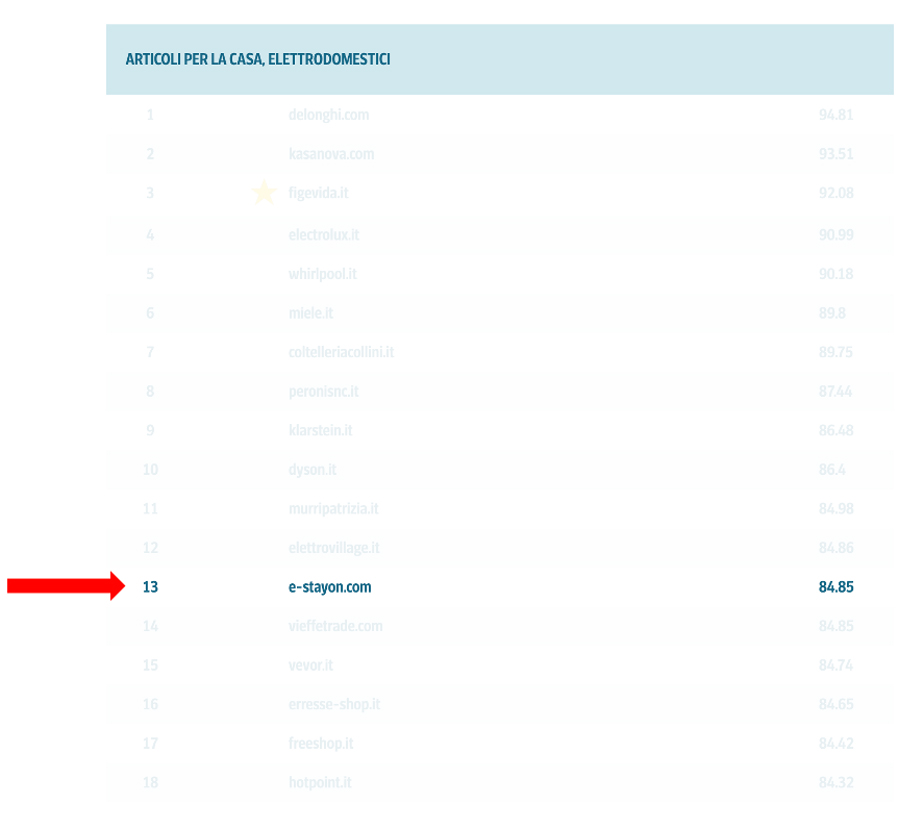 Il Corriere della Sera, in collaborazione con Statista, su 7000 aziende ha selezionato un campione di 500 players, suddivisi in diversi settori: Stay On è orgoglioso di annunciare di aver conquistato la posizione N.13 nel settore “Articoli per la casa, elettrodomestici” nella classifica delle "Stelle dell’E-commerce 2025".