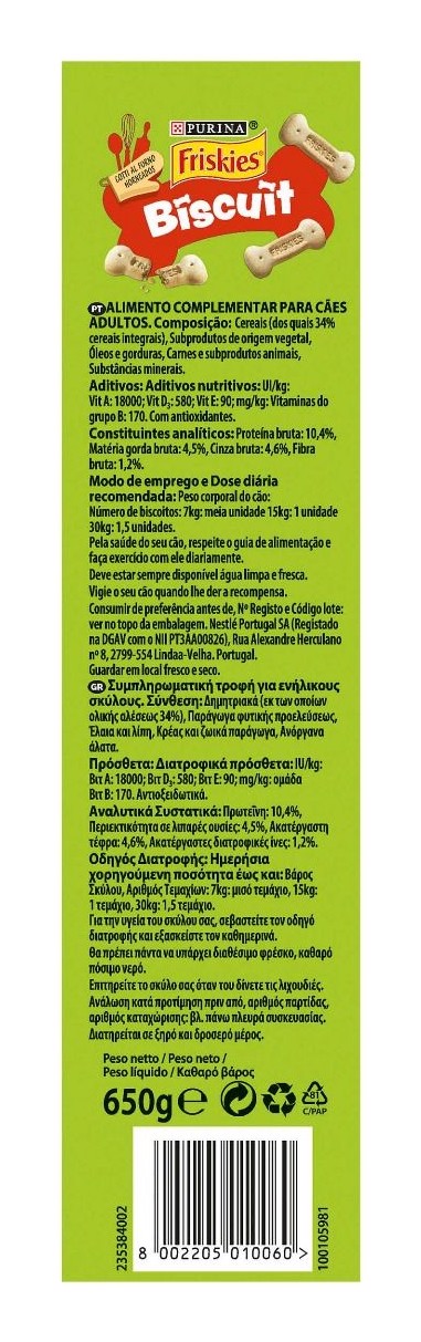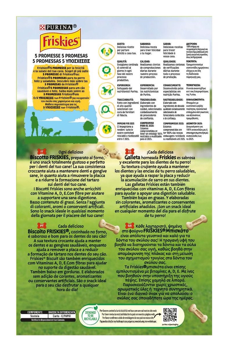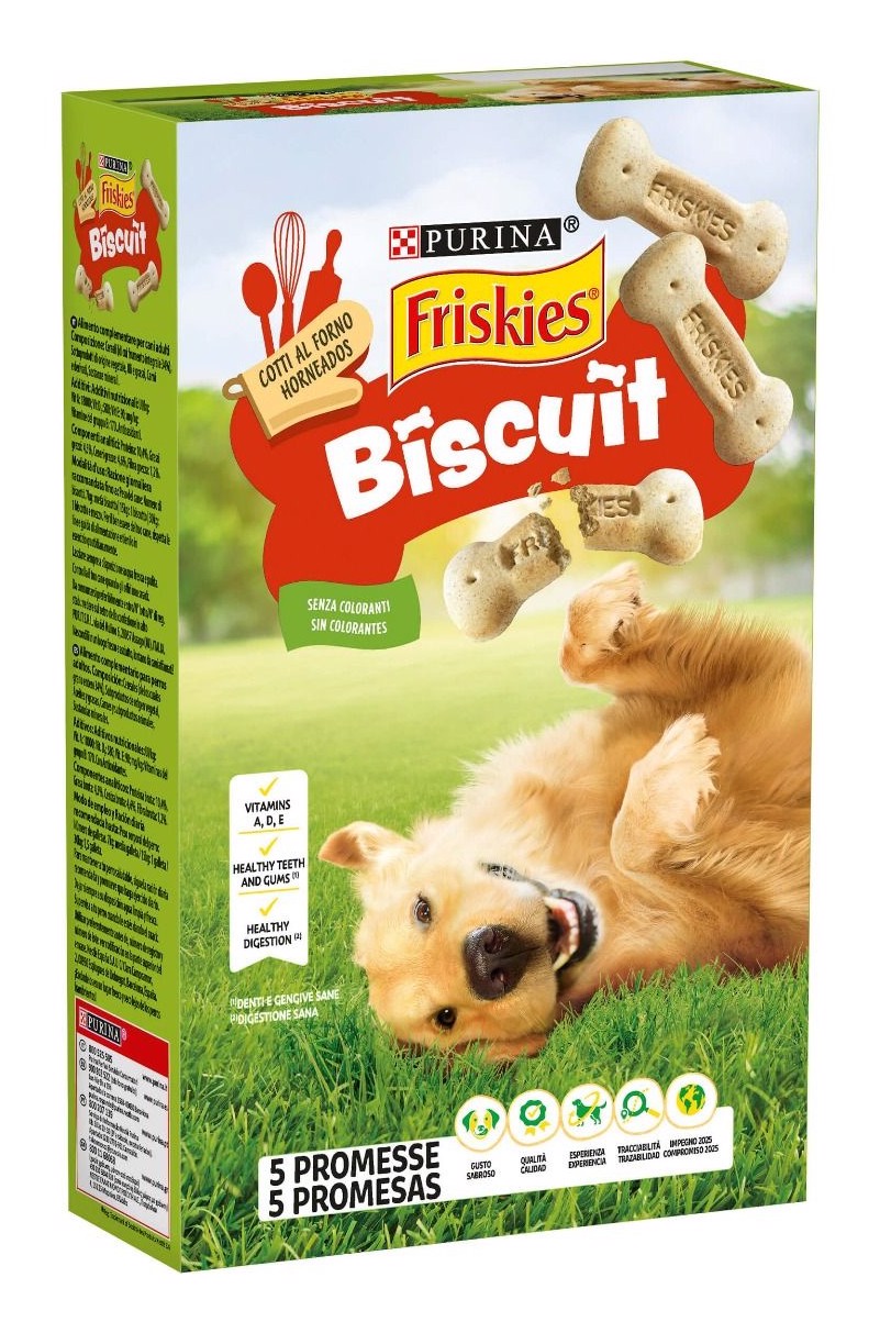 Ogni delizioso biscotto FRISKIES, preparato al forno, è uno snack totalmente gustoso e perfetto per i denti del tuo cane! La sua consistenza croccante aiuta a mantenere denti e gengive sane, in quanto aiuta a rimuovere la placca e a ridurre la formazione del tartaro sui denti del tuo cane. I Biscotti Friskies sono anche arricchiti con Vitamine A, D, E. Con fibre per aiutare a supportare una sana digestione. Basso contenuto di grassi. Senza l'aggiunta di coloranti, aromi o conservanti artificali. Sono lo snack ideale in qualsiasi momento della giornata per il piacere del tuo cane!