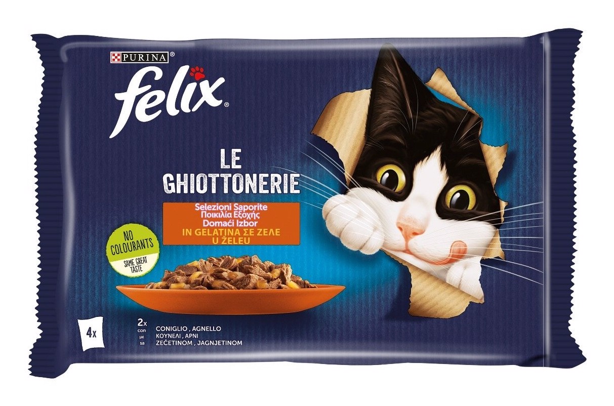 FELIX Le GHIOTTONERIE hanno un aspetto, un profumo e un gusto irresistibili. Ogni ricetta è preparata con teneri bocconcini in una succulenta gelatina per offrire al tuo gatto un pasto irresistibile!