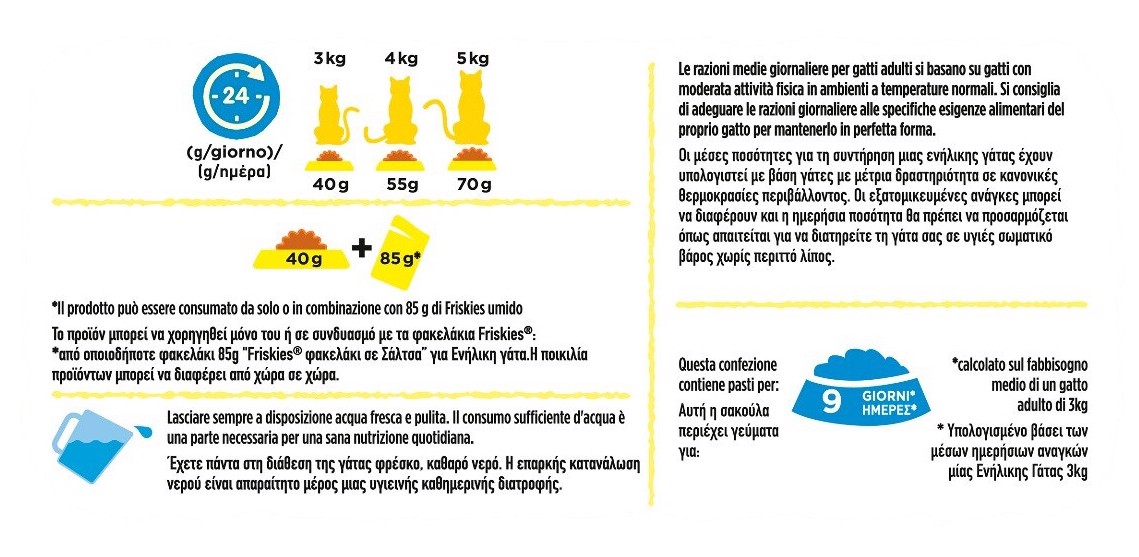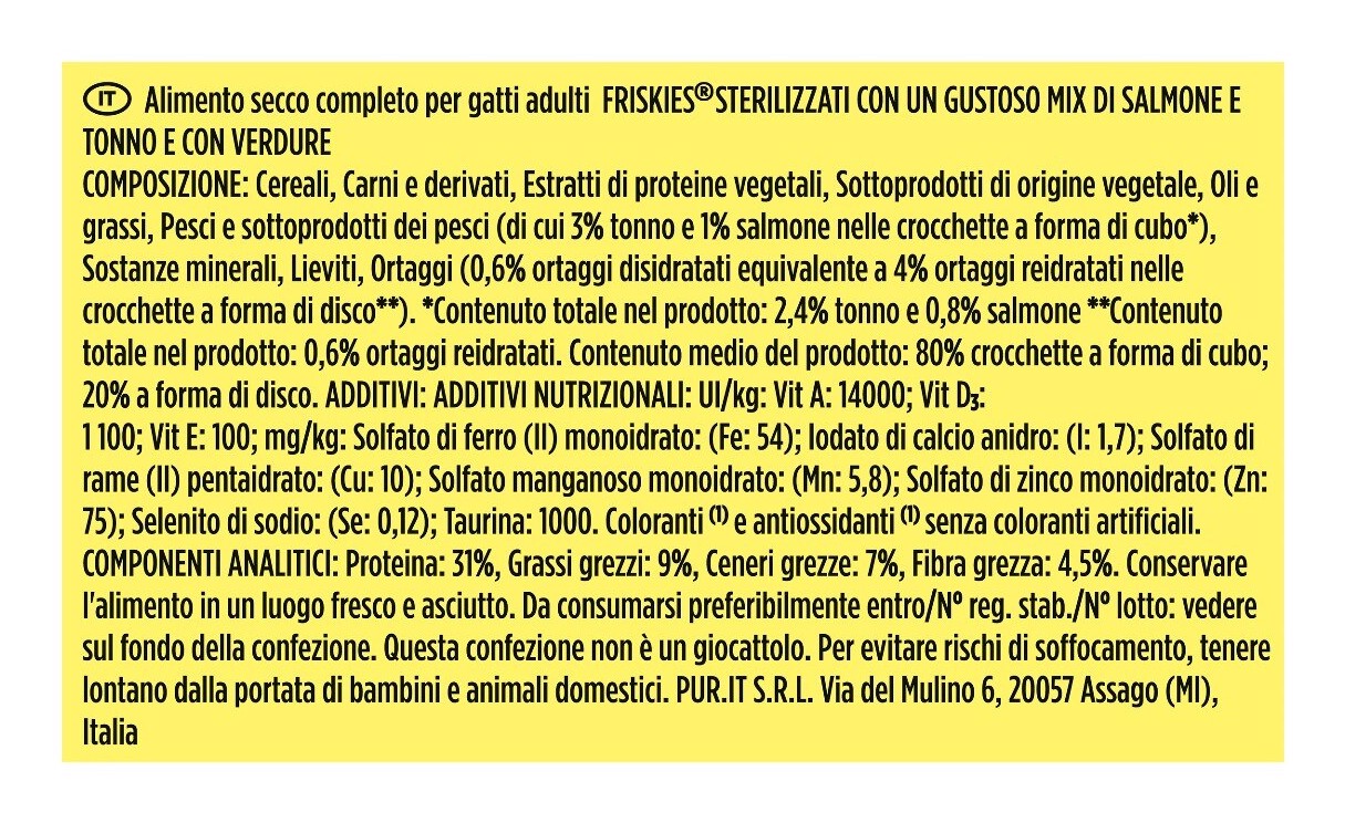 I nostri gatti sono esploratori per natura, curiosi verso tutto ciò che li circonda. E' questo che li rende membri della famiglia così affascinanti e che porta vitalità nella nostra casa. Quando i gatti sono sterilizzati però, tendono ad aumentare di peso e potrebbero sviluppare problemi al tratto urinario. Per questo gli esperti Purina® hanno creato Friskies® per Gatti Sterilizzati: appositamente formulato per soddisfare i bisogni nutrizionali specifici dei gatti sterilizzati. No Coloranti, Aromatizzanti o Conservanti artificiali aggiunti Friskies® da decenni nutre i gatti con alimenti buoni e genuini. Riempiamo milioni di ciotole e da questo onore deriva una grande responsabilità. Per questo le ricette Friskies® sono studiate senza aggiunta di coloranti, aromatizzanti o conservanti artificiali. Così potrai continuare a nutrirli con lo stesso alimento delizioso che loro amano, sentendoti orgoglioso della tua scelta.