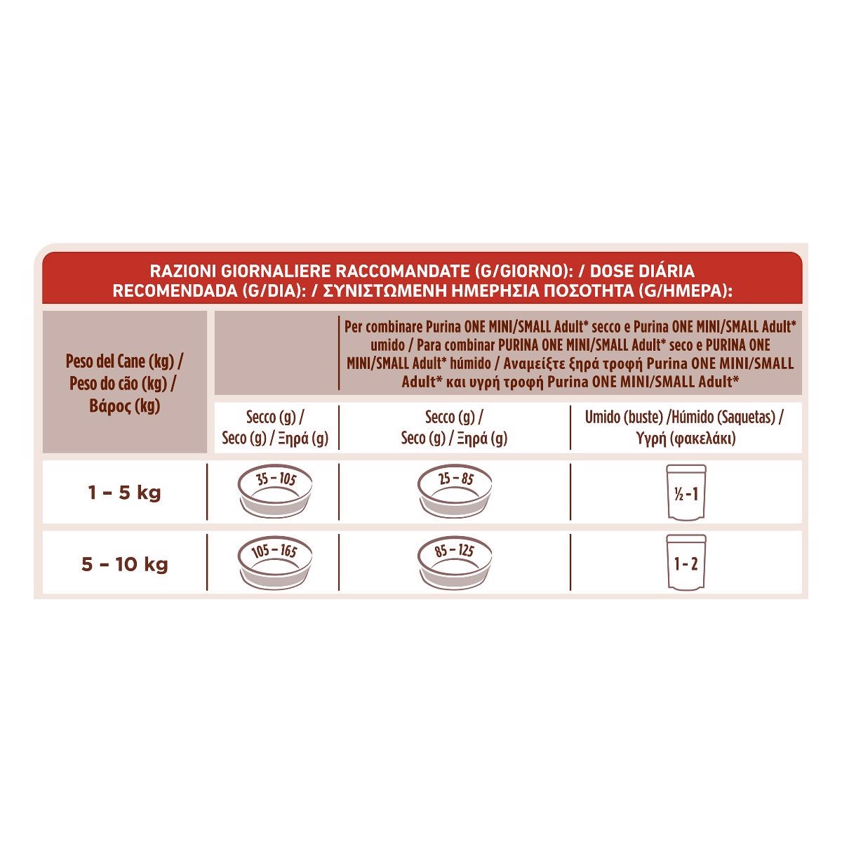 Istruzioni per l'alimentazione: Quantità giornaliera consigliata (g/giorno): Peso del cane: | Quantità: 1 - 5 kg 30 - 95 g 5 - 10 kg 95 - 150 g Modalità d'uso: Le quantità giornaliere raccomandate devono essere modificate in base alle condizioni climatiche, al livello di attività del cane e alla sua condizione fisica. Lasciare sempre a disposizione acqua pulita e fresca. Se somministri PURINA ONE per la prima volta, ti raccomandiamo di introdurlo gradualmente mescolando una crescente quantità di PURINA ONE all'alimentazione abituale del tuo cane nell'arco di 7 giorni per permettere al suo apparato digerente di adattarsi al cambiamento. Conservazione Conservare il prodotto chiuso in luogo fresco e asciutto. Questa confezione non è un giocattolo. Per evitare il rischio di soffocamento tenere lontano dalla portata di bambini ed animali.