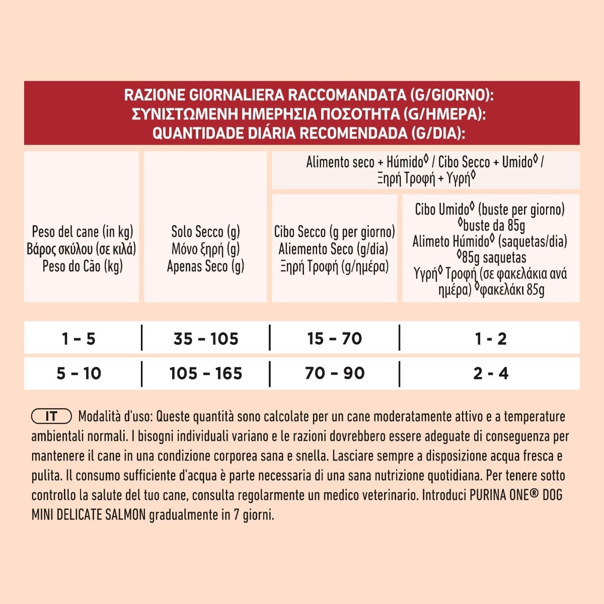 PURINA ONE® MINI/SMALL < 10kg Delicate è una gustosa ricetta con Salmone, con elevato contenuto di acidi grassi Omega 3, per aiutare a gestire la sua pelle sensibile e con un prebiotico naturale per supportare la sua digestione delicata.