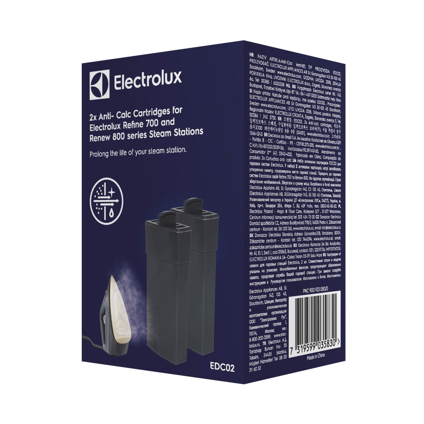 Electrolux ACCESSORI STIRO EDC02. Tipo: Cartuccia anticalcare per ferro da stiro, Colore del prodotto: Nero, Prodotti compatibili: Refine 700 Renew 800. Peso: 270 g. Tipo di imballo: Scatola. Quantità per pacco: 2 pz