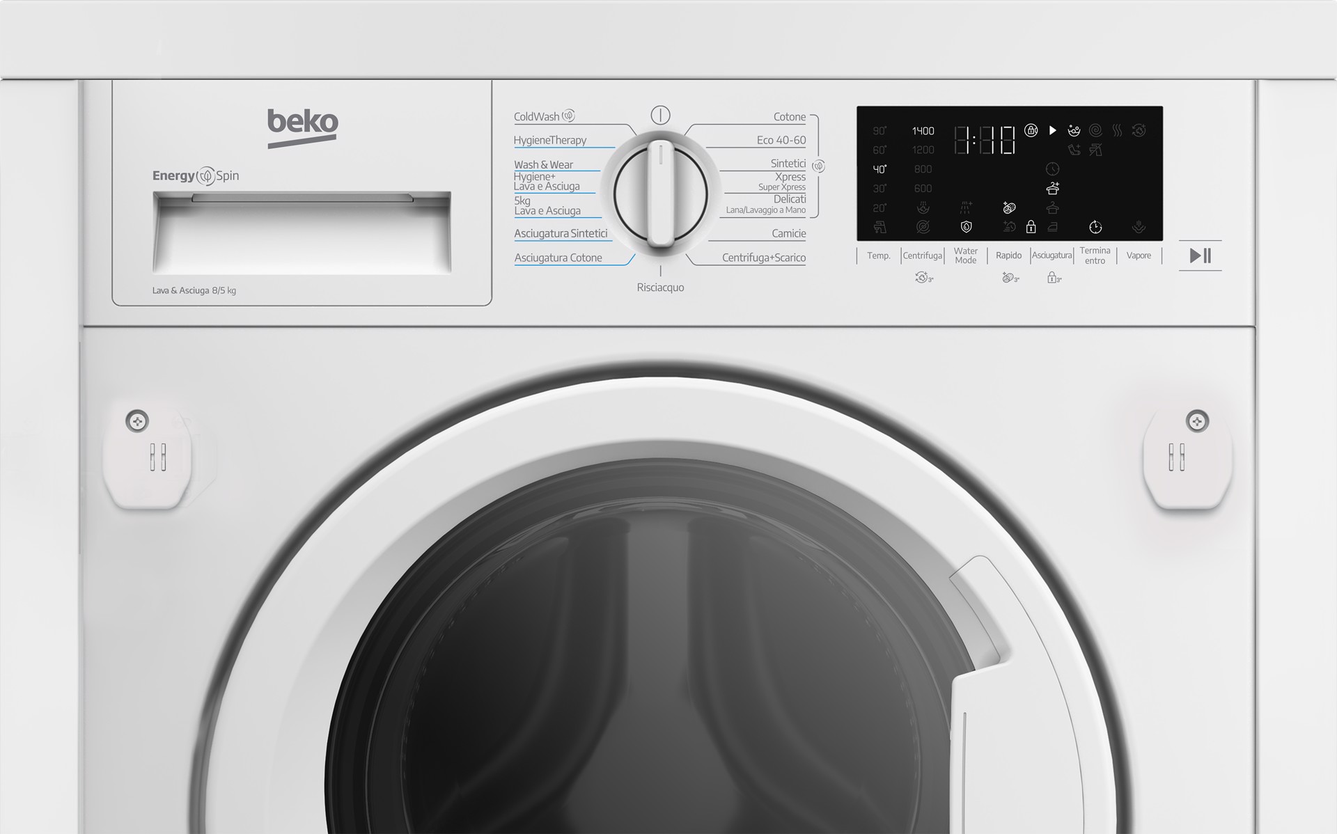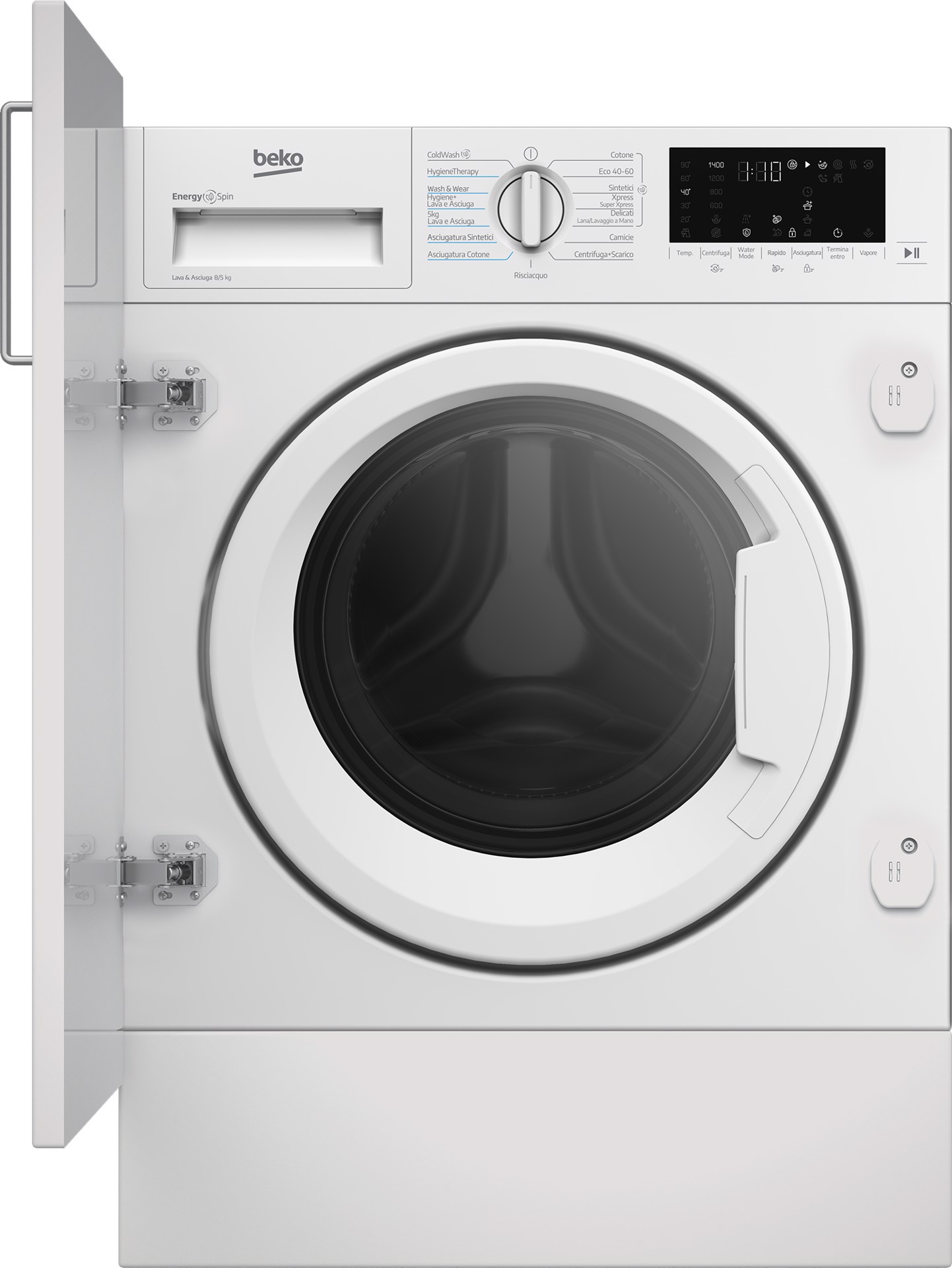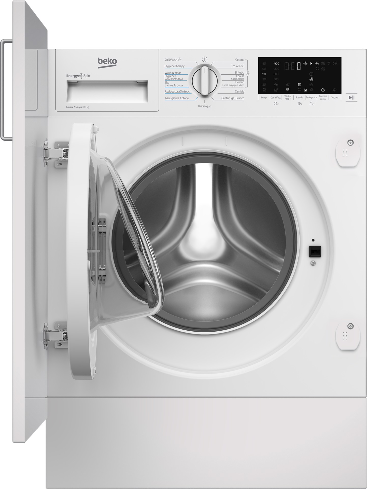 WDI85DAW_IT: Lavasciuga da incasso, Capacità 8kg+5kg, classe D|A, colore bianco, Motore Inverter BPM, Caricamento frontale, Da incasso, Bianco, Sinistra, Bianco, Manopola, Touch