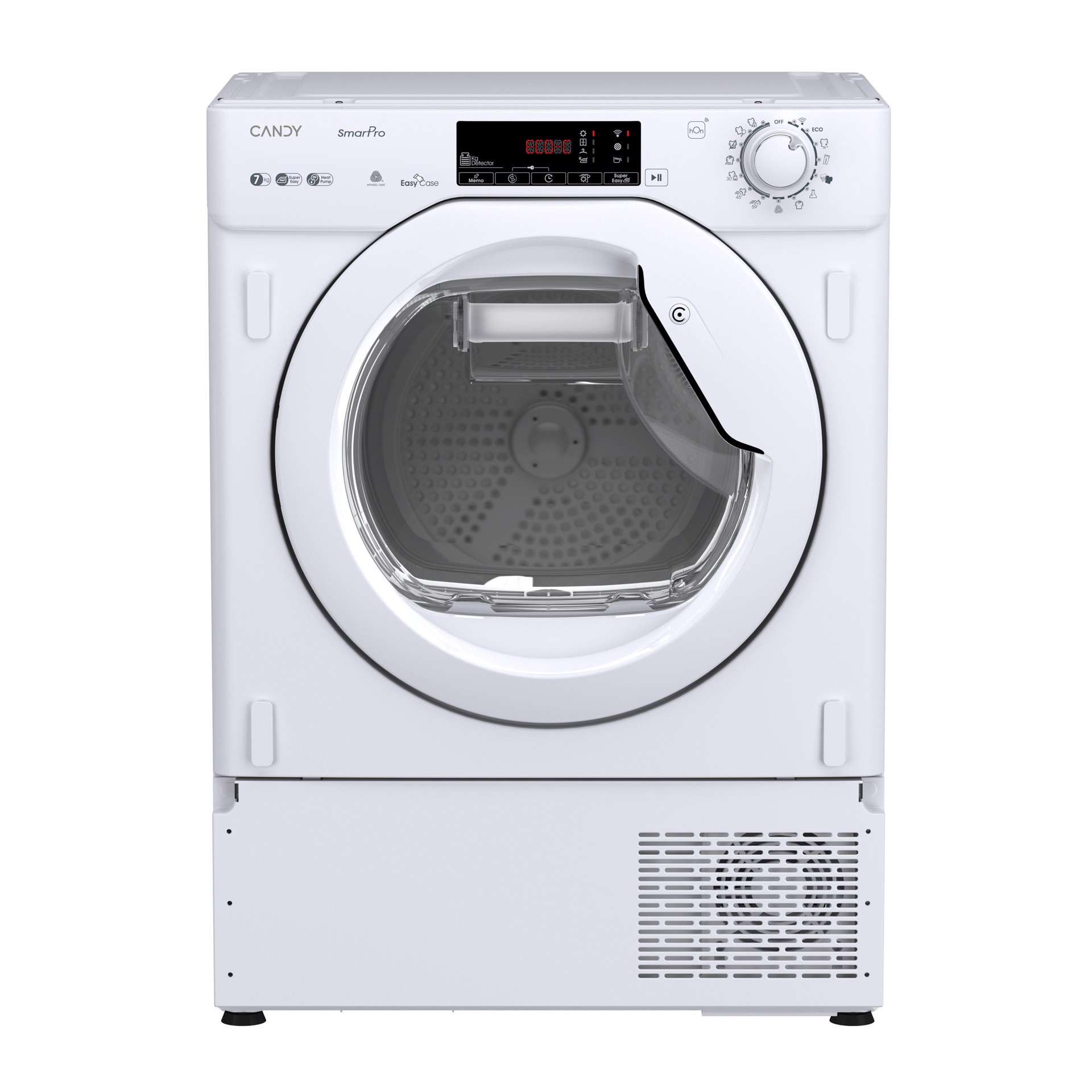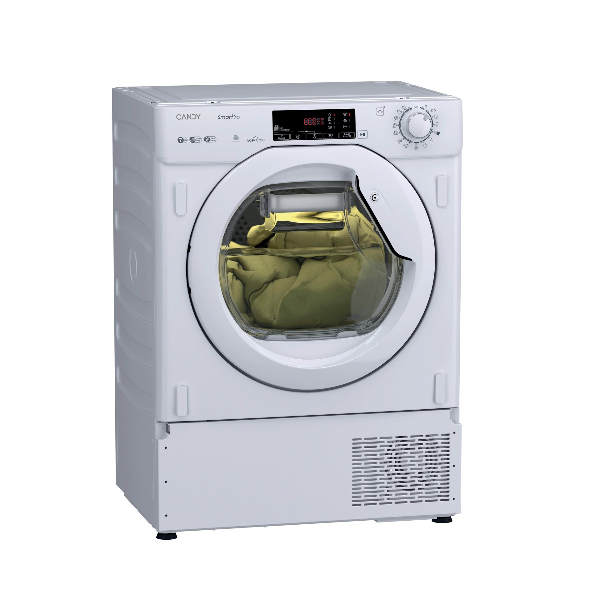 Candy BCTD H7A2TE-S. Posizionamento dell'apparecchio: Da incasso, Tipo di carica: Caricamento frontale, Sistema di asciugatura: Pompa di calore. Capacità cestello: 7 kg, Classe di efficienza della condensazione: C, Programmi di asciugatura: Vestiti bianchi, Dark clothes, Lana, Sport, Risciacquo, Eco, Jeans/denim, Camicia/maglietta,.... Partenza ritardata: 24 h, Applicazioni per il controllo supportate: hOn. Classe efficienza energetica: E, Consumo energetico per 100 cicli: 112 kWh, Fonte di calore: Elettrico. Profondità: 492 mm, Larghezza: 596 mm, Altezza: 850 mm