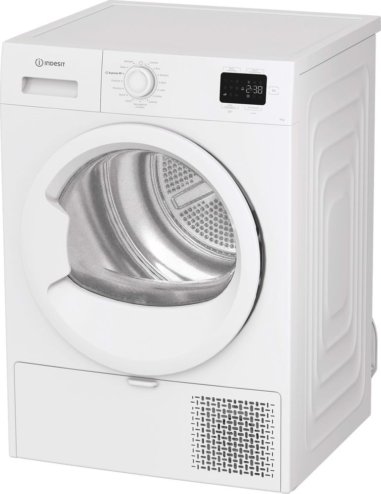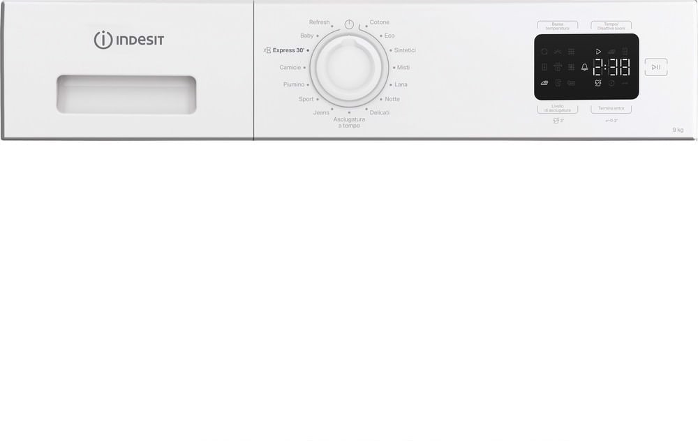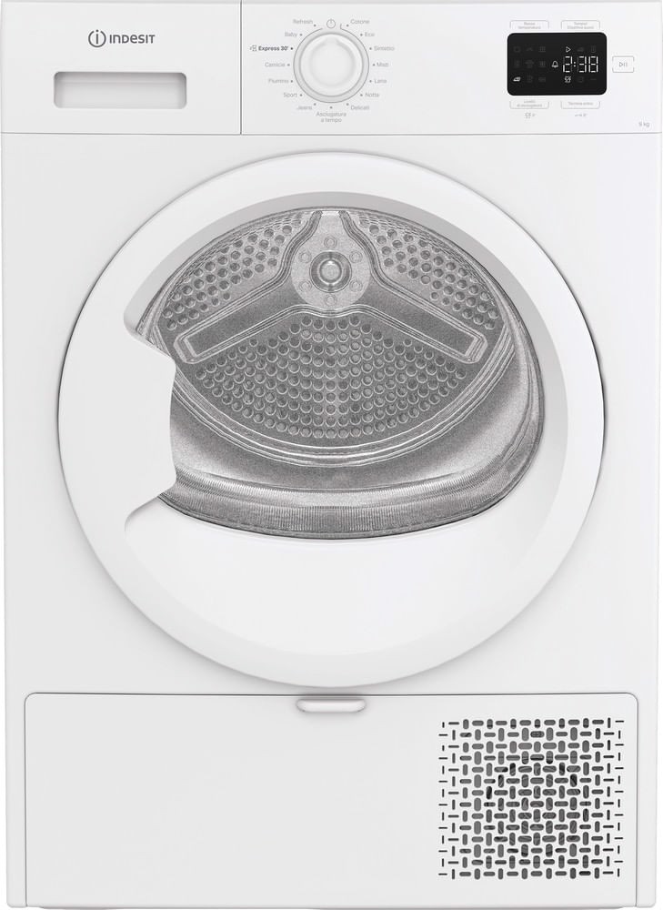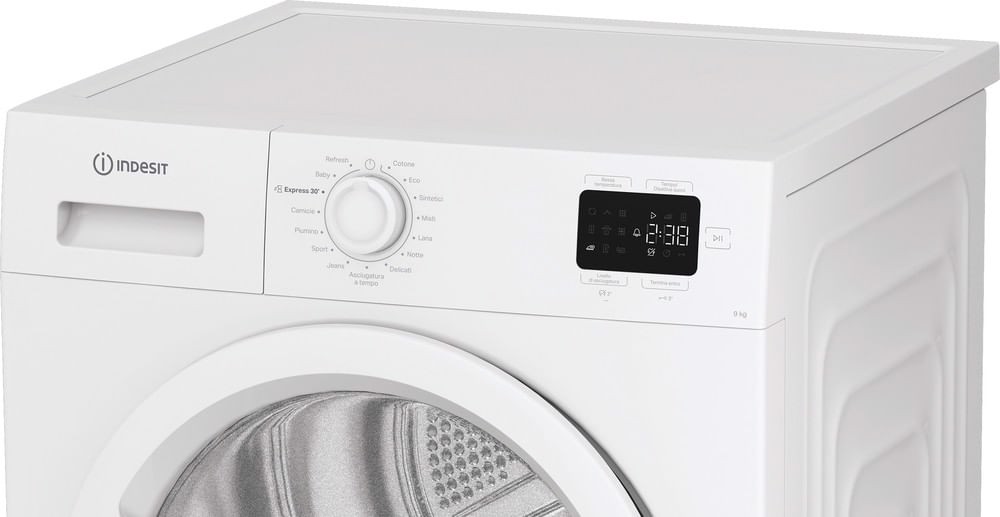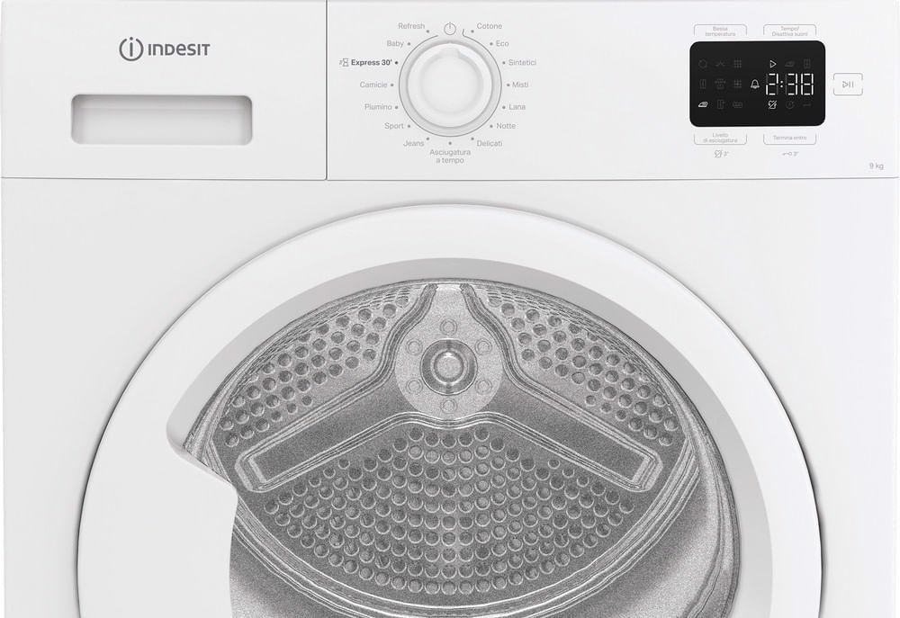 Caratteristiche di questa asciugatrice a libera installazione Indesit: eccezionale capacità del cestello di 9,0 kg per non restare mai senza spazio.