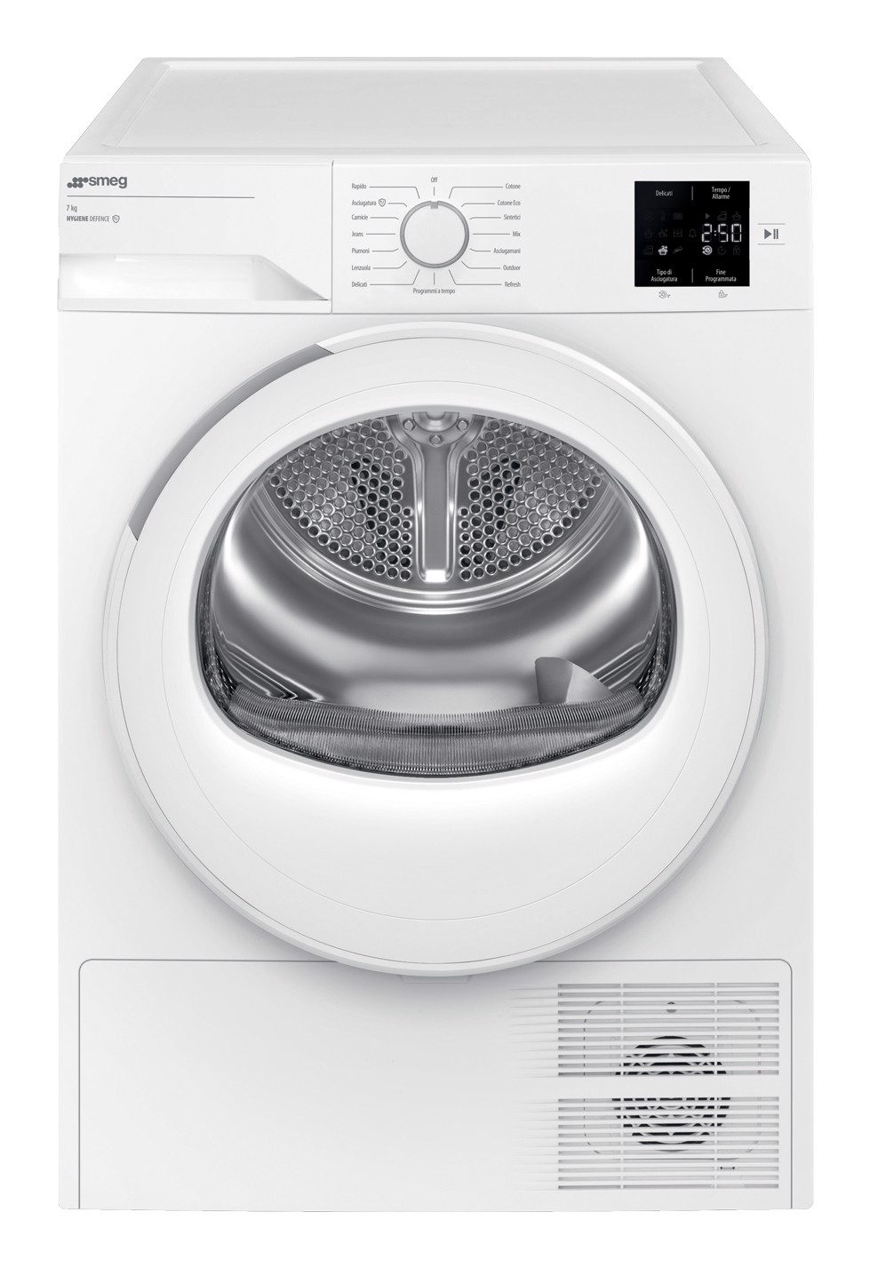 Smeg DRC07EE. Posizionamento dell'apparecchio: Libera installazione, Tipo di carica: Caricamento frontale, Sistema di asciugatura: Pompa di calore. Capacità cestello: 7 kg, Classe di efficienza della condensazione: C, Programmi di asciugatura: Cotone, Delicati/Seta, Piumino/piumone, Igiene/Allergy Care, Jeans/denim, Mix, Outdoor/sport,.... Classe efficienza energetica: E, Consumo energetico per 100 cicli: 133 kWh, Consumo energetico: 1,33 kWh. Profondità: 546 mm, Larghezza: 598 mm, Altezza: 846 mm