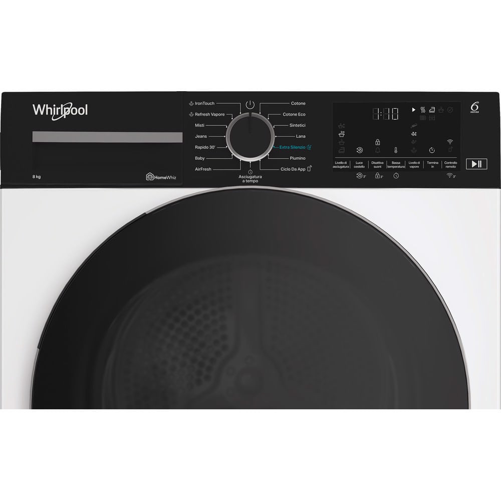Caratteristiche di questa asciugatrice a libera installazione Whirlpool: cestello spazioso da 8,0 kg. Esclusiva tecnologia 6° SENSO che monitora costantemente il livello di umidità nel tamburo per proteggere i tuoi vestiti e garantire un'asciugatura perfetta. Funzione di connessione che consente all'elettrodomestico di ricevere informazioni riguardo il ciclo di lavaggio utilizzato e regolare le impostazioni di conseguenza per risultati perfetti. Azione di asciugatura delicata e igienica, che riduce le pieghe e rinfresca i tuoi vestiti. Tecnologia a pompa di calore riscalda efficacemente l’aria nell'elettrodomestico, riducendo significativamente il consumo energetico.