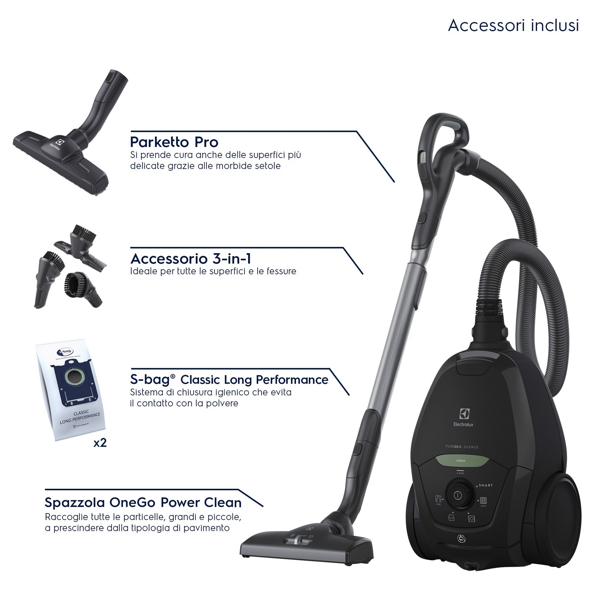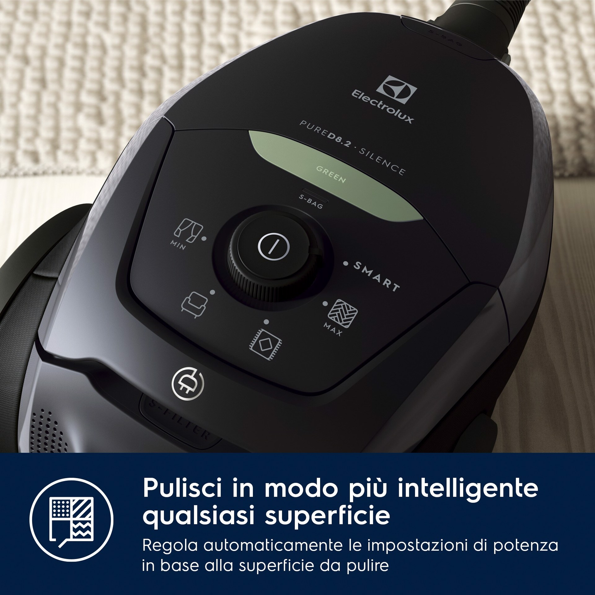 PURE D8.2 assicura una aspirazione innovativa. Tecnologia SmartMode, sistema PureSound e spazzola OneGo Power Clean. Ideato per per una pulizia impeccabile, intelligente e incredibilmente silenziosa.