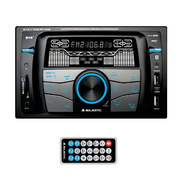 New Majestic SV-517 RDS BT DAB. Colore del prodotto: Nero, Grandezza DIN: 2 DIN, Potenza in uscita: 180 W. Versione Bluetooth: 2.1+EDR, Posizione della porta USB: Frontale. Bande del sintonizzatore: DAB,FM. Larghezza: 160 mm, Profondità: 190 mm, Altezza: 120 mm