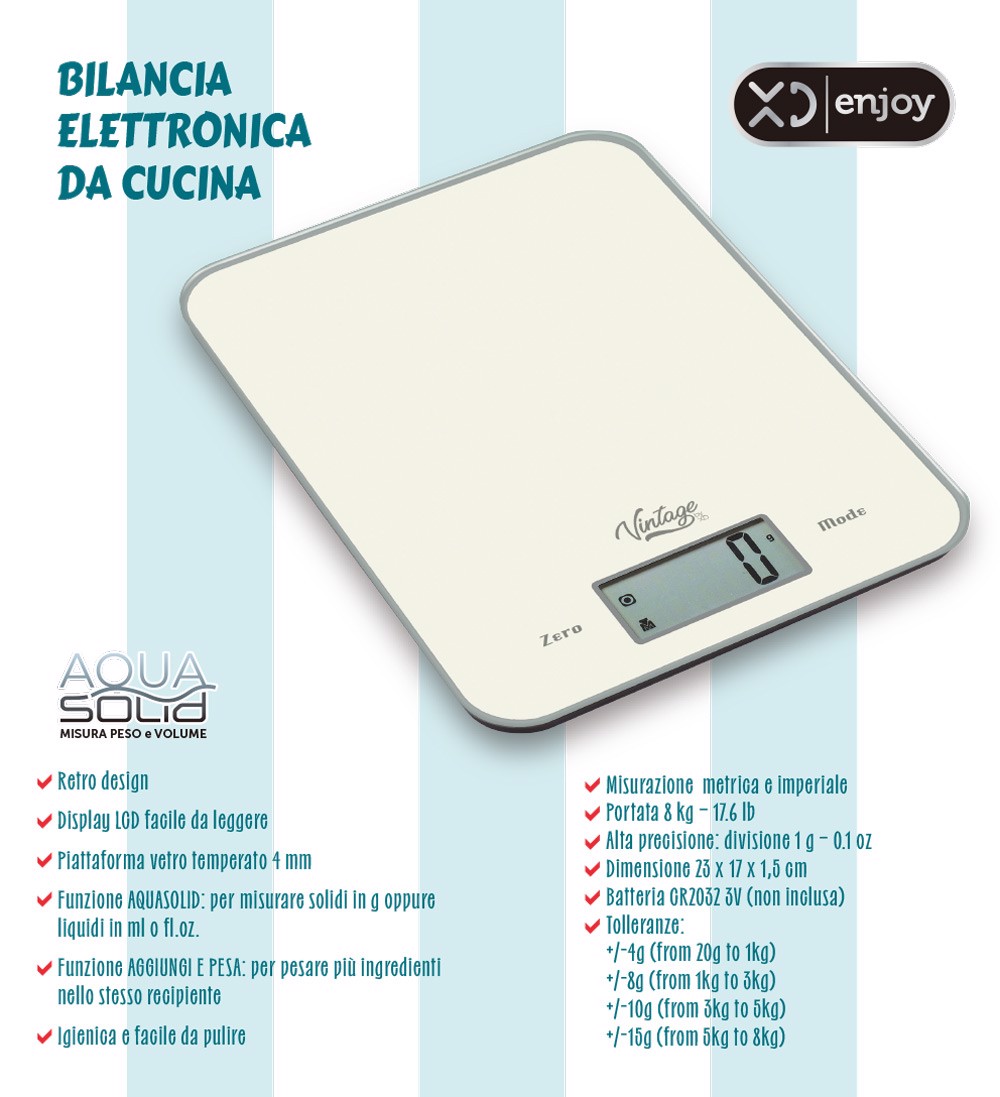 XD Vintage XDCAM9160K. Tipo: Bilancia da cucina elettronica, Peso massimo (capacità): 8 kg, Precisione: 1 g. Tipo di display: LCD. Tipo batteria: CR2032, Voltaggio della batteria: 3 V. Larghezza: 170 mm, Profondità: 230 mm, Altezza: 15 mm. Quantità per pacco: 1 pz