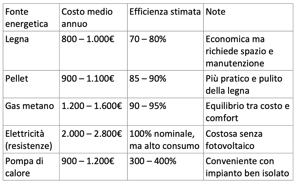 In un' ottica di lungo periodo, la legna o il pellet sono le soluzioni più economiche, specialmente in campagna o nelle aree agricole dove la materia prima è più accessibile; c'è da dire, però, che bisogna considerare i costi iniziali di installazione e manutenzione della stufa o caldaia.