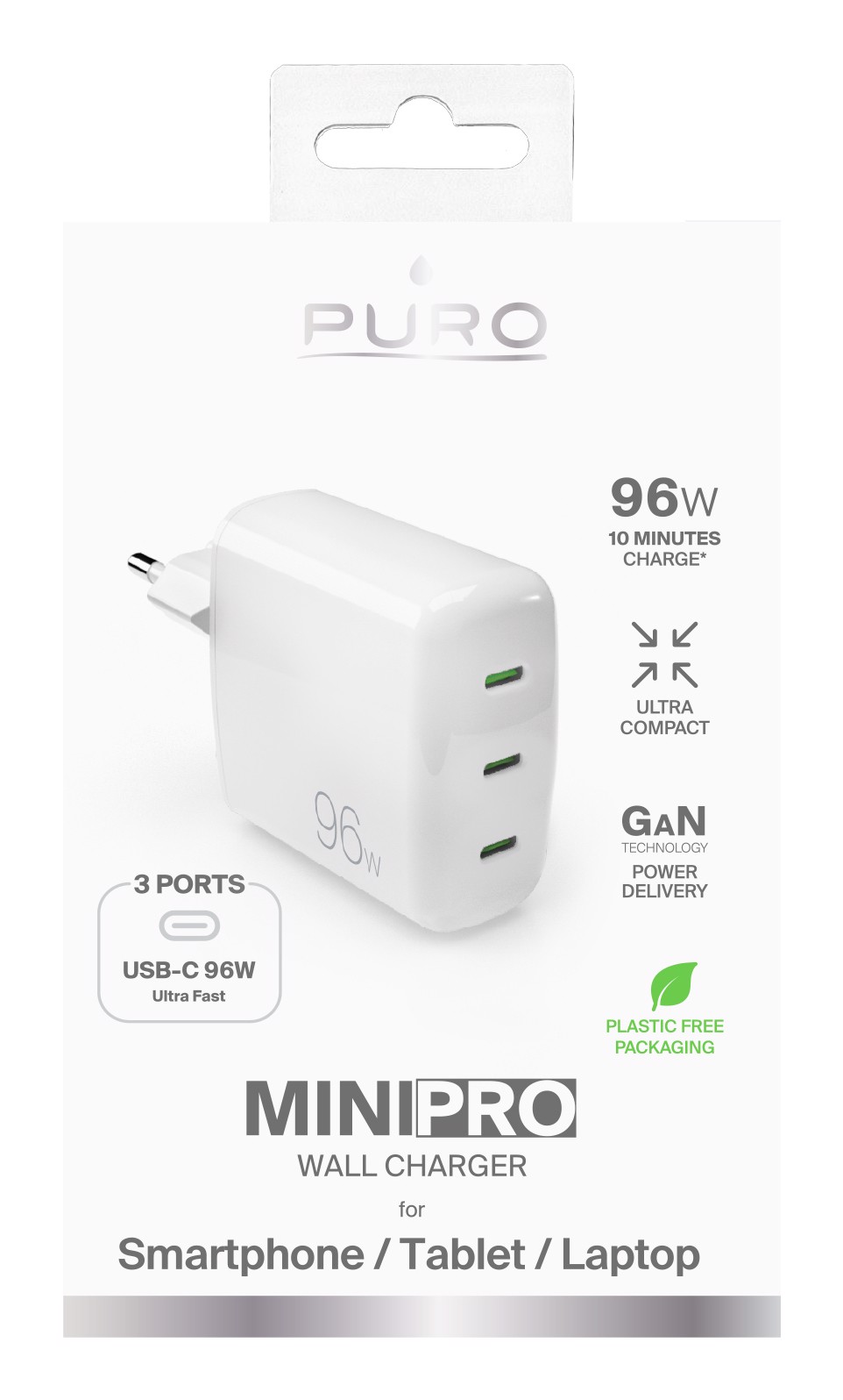 Sei alla ricerca di un caricabatterie da parete dalle prestazioni uniche, performanti e sicure, e che ti permetta di caricare più di un device contemporaneamente?  Abbiamo proprio quello che fa per te! Il caricabatterie da parete MiniPro 96W di Puro è la soluzione ideale per caricare in velocità e in totale sicurezza tre dispositivi, fornendo una soluzione di ricarica flessibile e versatile.  Dalle dimensioni ridotte e compatte e con tecnologia GaN, è dotato di tre porte USB-C con le quali è possibile caricare due dispositivi con un’erogazione totale di 96W. L’innovativa tecnologia GaN permette di dissipare il calore evitando surriscaldamenti, e assieme alla tecnologia Power Delivery delle tre porte USB-C offrono elevate prestazioni di ricarica. MiniPro 96W è la soluzione universale perfetta per la ricarica di tutti i tuoi dispositivi: un unico caricabatterie da parete per tutti i tuoi smartphone, tablet e laptop. E grazie al design leggero e compatto, il caricatore è facile da trasportare ovunque. La ricarica è estremamente veloce, consente di raggiungere il 100% della batteria dello smartphone in soli 10 minuti, del tablet in soli 20 minuti, e del laptop in 30 minuti*.  Scegli la massima potenza, il massimo risparmio di tempo e il massimo risparmio di spazio con caricatore da parete MiniPro da96W: non tornerai più indietro!