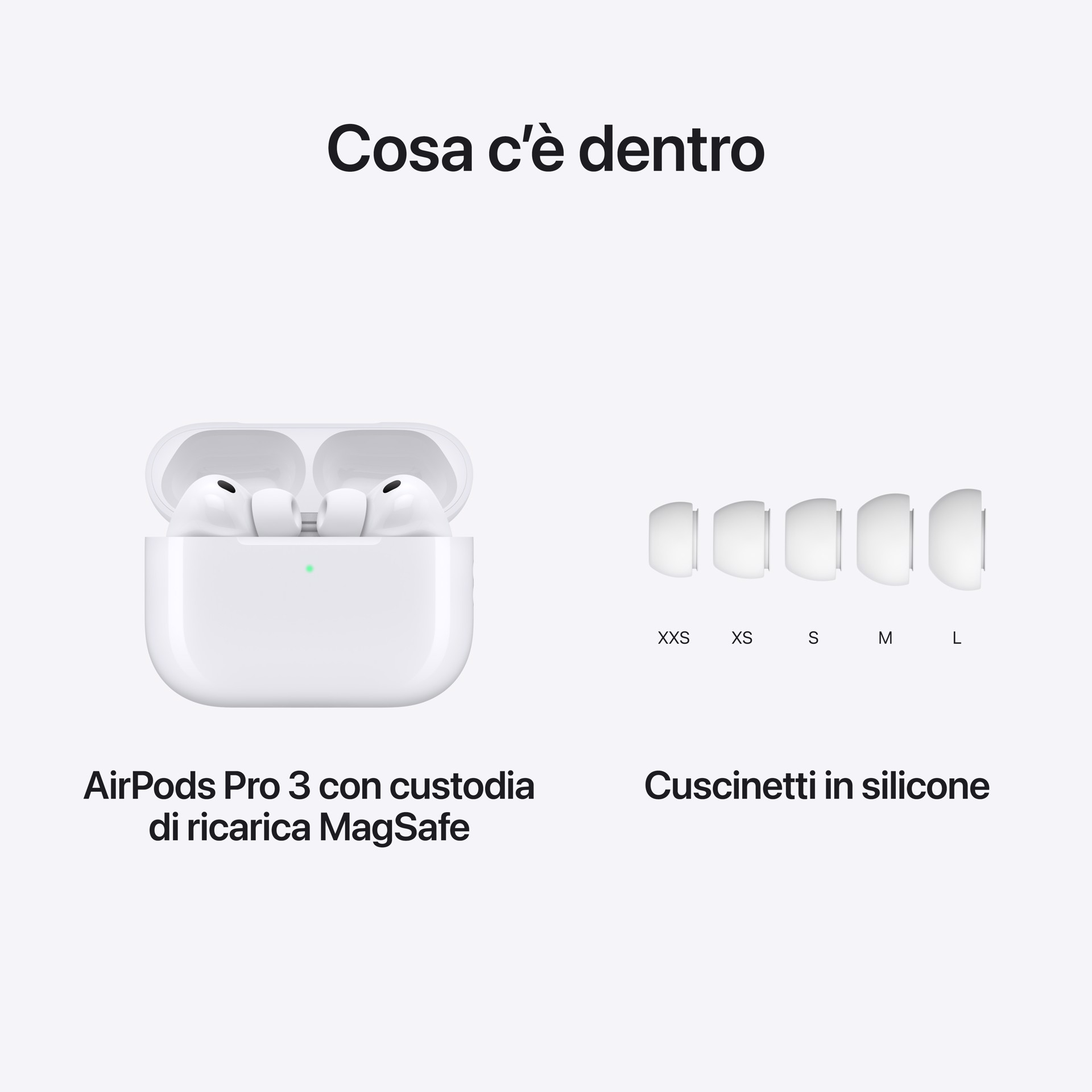 AirPods Pro 3. Cancellazione attiva del rumore fino a 2 volte più efficace rispetto agli AirPods Pro 2.1 Ora con rilevamento della frequenza cardiaca, Traduzione in tempo reale, maggiore autonomia e funzioni per la salute dell’udito migliorate. Design rinnovato per adattarsi meglio a ogni forma di orecchio.