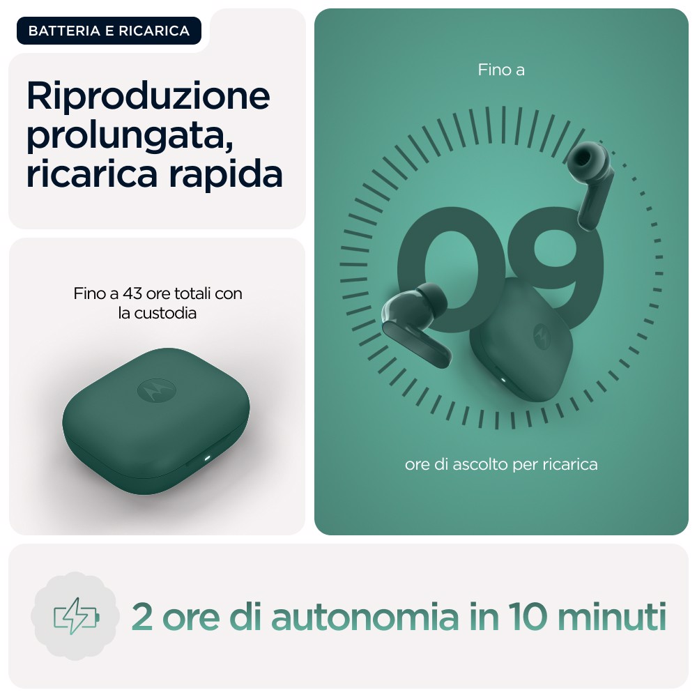Che si tratti del drop nel tuo brano preferito o del ritmo che ti tiene in movimento, il basso è qualcosa che dovresti sentire. Motorola presenta i moto buds bass, con un ampio driver dinamico appositamente ottimizzato per bassi profondi e potenti e audio ad alta risoluzione.(1) Immergiti nella musica e nei film con un audio profondo e di impatto e bassi ricchi che animano ogni beat. Escludi il mondo attorno a te o mantieni la percezione dell'ambiente che ti circonda durante l'ascolto con l'eliminazione attiva e dinamica del rumore. Goditi chiamate vocali cristalline grazie al sistema con tre microfoni su ogni auricolare. Personalizza e controlla facilmente la tua esperienza di ascolto con l'app Moto Buds.(8) Oltre a tutto ciò, infinite ore di autonomia, ricarica rapida e design idrorepellente.(2) Senti il ritmo prendere vita con i moto buds bass.