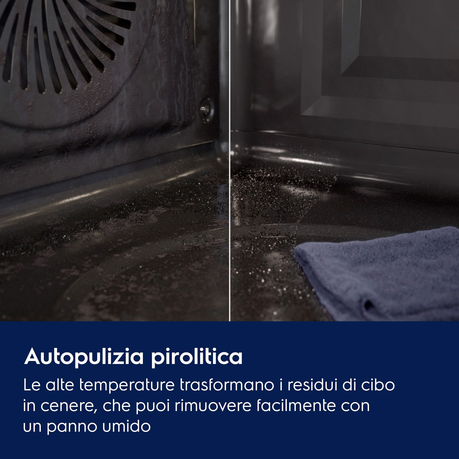 Grazie alle alte temperature, la funzione di pulizia pirolitica trasforma in cenere i residui di grasso e di cibo, che possono essere facilmente eliminati con un panno umido.