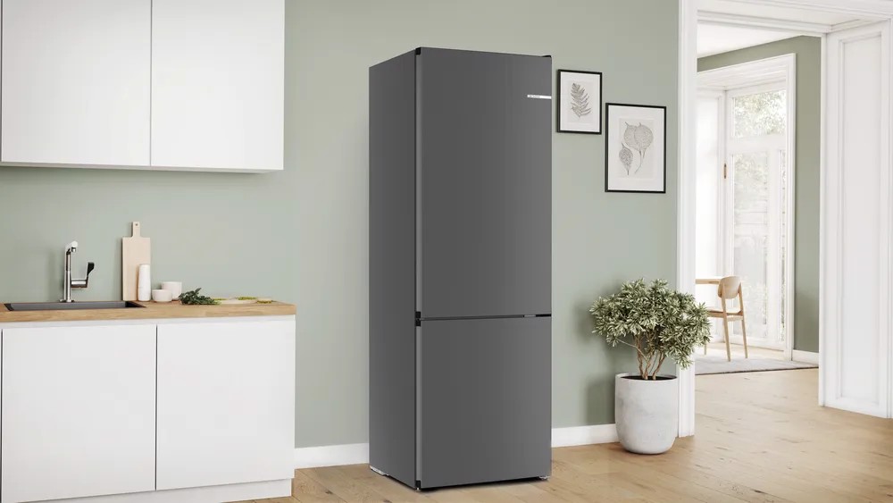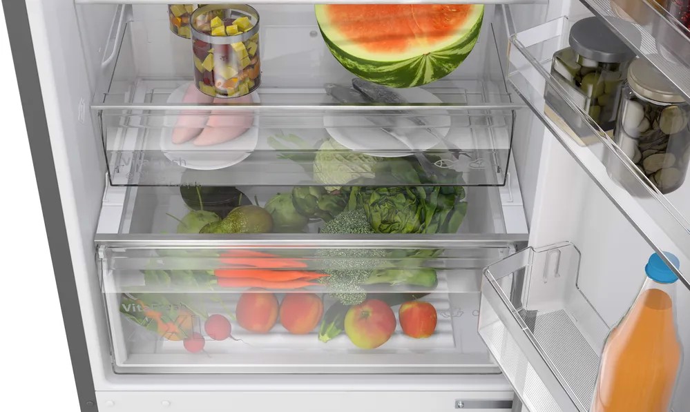 Posiziona il tuo frigorifero dove preferisci. Altri modelli di frigoriferi combinati standard sul mercato richiedono circa 10 cm di distanza dalle pareti laterali per poter aprire porta e cassetti mentre grazie a Perfect Fit, il frigorifero Bosch può essere posizionato proprio contro pareti e mobili. Inoltre, con la porta del frigorifero aperta a 90°, è possibile aprire completamente i cassetti o rimuoverli per una pulizia senza problemi.