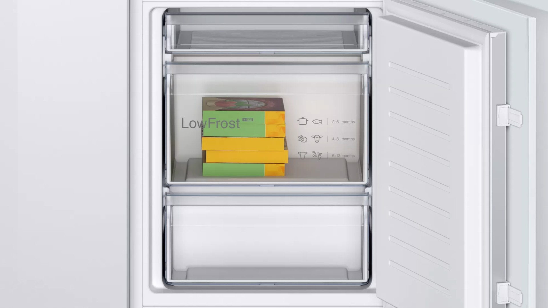Bosch Serie 2 KIV865SE0 Frigorifero Combinato da incasso 177,2 x 54,1 cm Classe E. Capacità netta totale: 267 L. Cerniera porta: Destra. Classe climatica: SN-ST, Emissione acustica: 35 dB. Capacità netta frigorifero: 183 L, Luce interna, Numero di ripiani frigorifero: 4, Numero di cassetti per verdura: 1. Capacità netta congelatore: 84 L, Capacità di congelamento: 4,2 kg/24h. Classe efficienza energetica: E, Consumo energetico annuo: 229 kWh. Colore del prodotto: Bianco