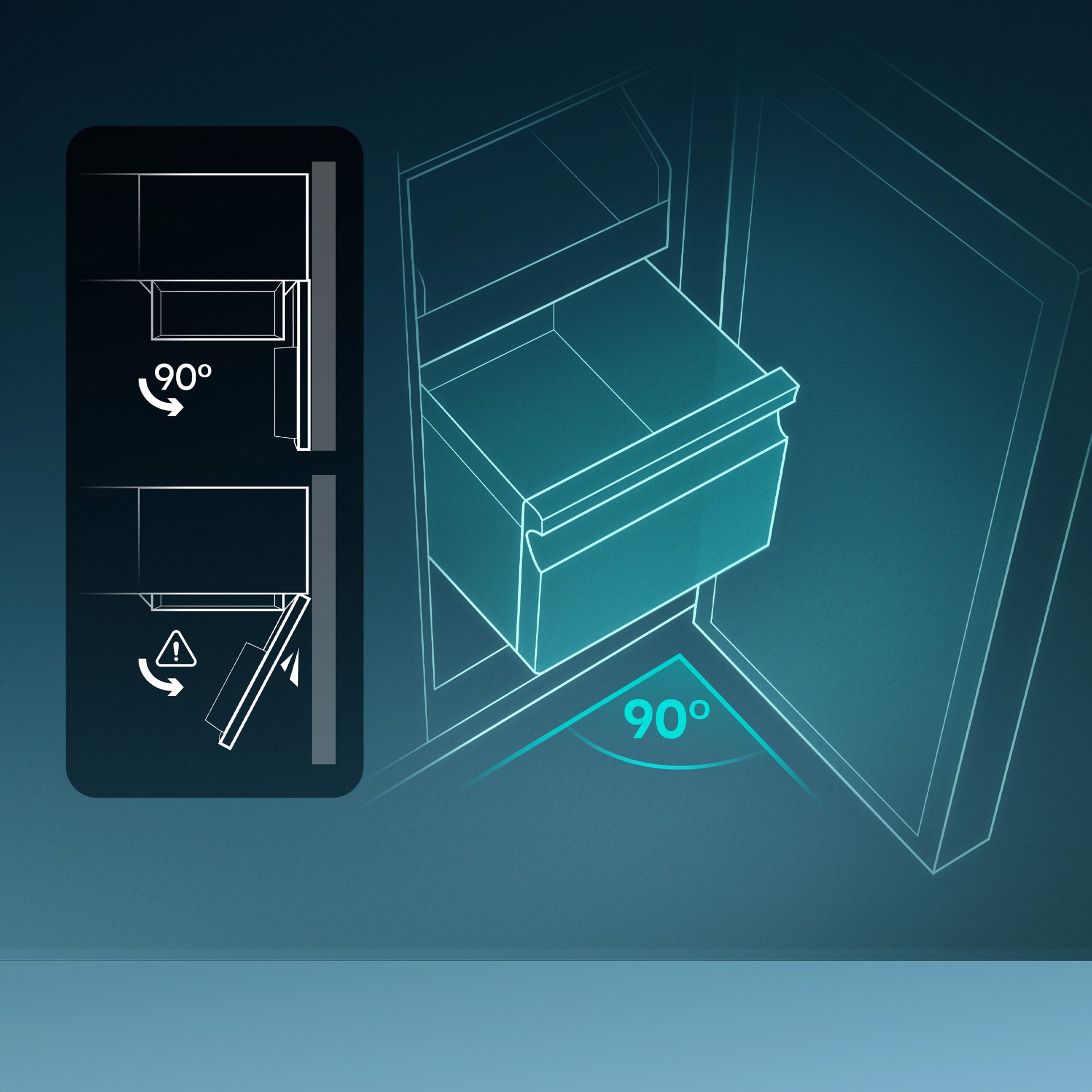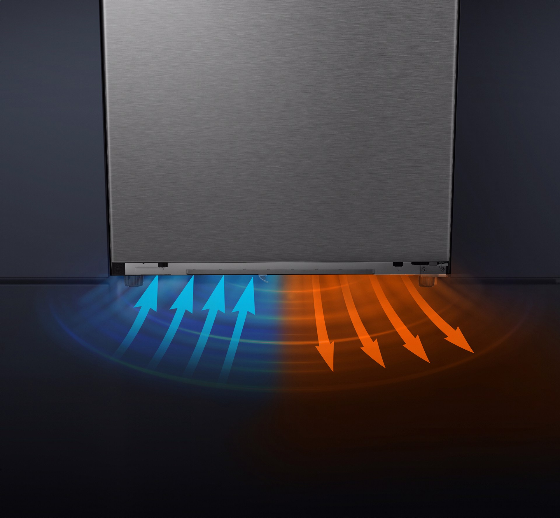 •Sistema di raffreddamento dal basso: Progettato per aspirare l'aria da sinistra e espellerla da destra, separando con successo l'aria fredda proveniente dall'esterno da quella calda all'uscita dell'aria. Questo crea un flusso d'aria tra la base del frigorifero e il pavimento, migliorando l'efficienza energetica e consentendo un design adatto alla cucina.