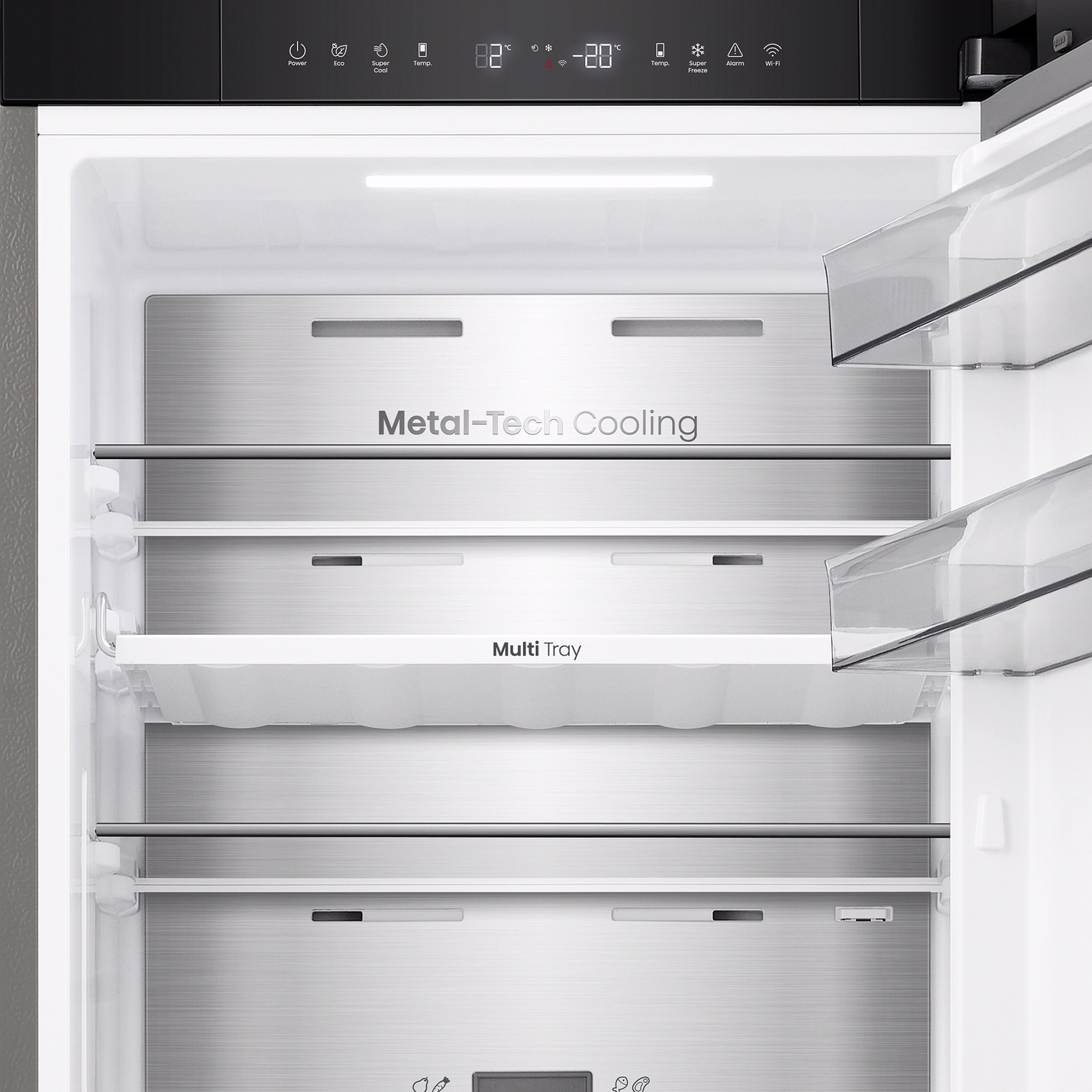 •Metal Tech Cooling: Ridefinisci l'eleganza della refrigerazione con la tecnologia Metal-Tech Cooling di Hisense. Questa ingegnosa funzione combina una parete posteriore in acciaio inossidabile per un raffreddamento uniforme ed efficiente dal punto di vista energetico con un design raffinato, migliorando lo stile e la funzionalità della tua cucina. Abbraccia un nuovo standard di freschezza ed estetica premium in un'unica soluzione sofisticata