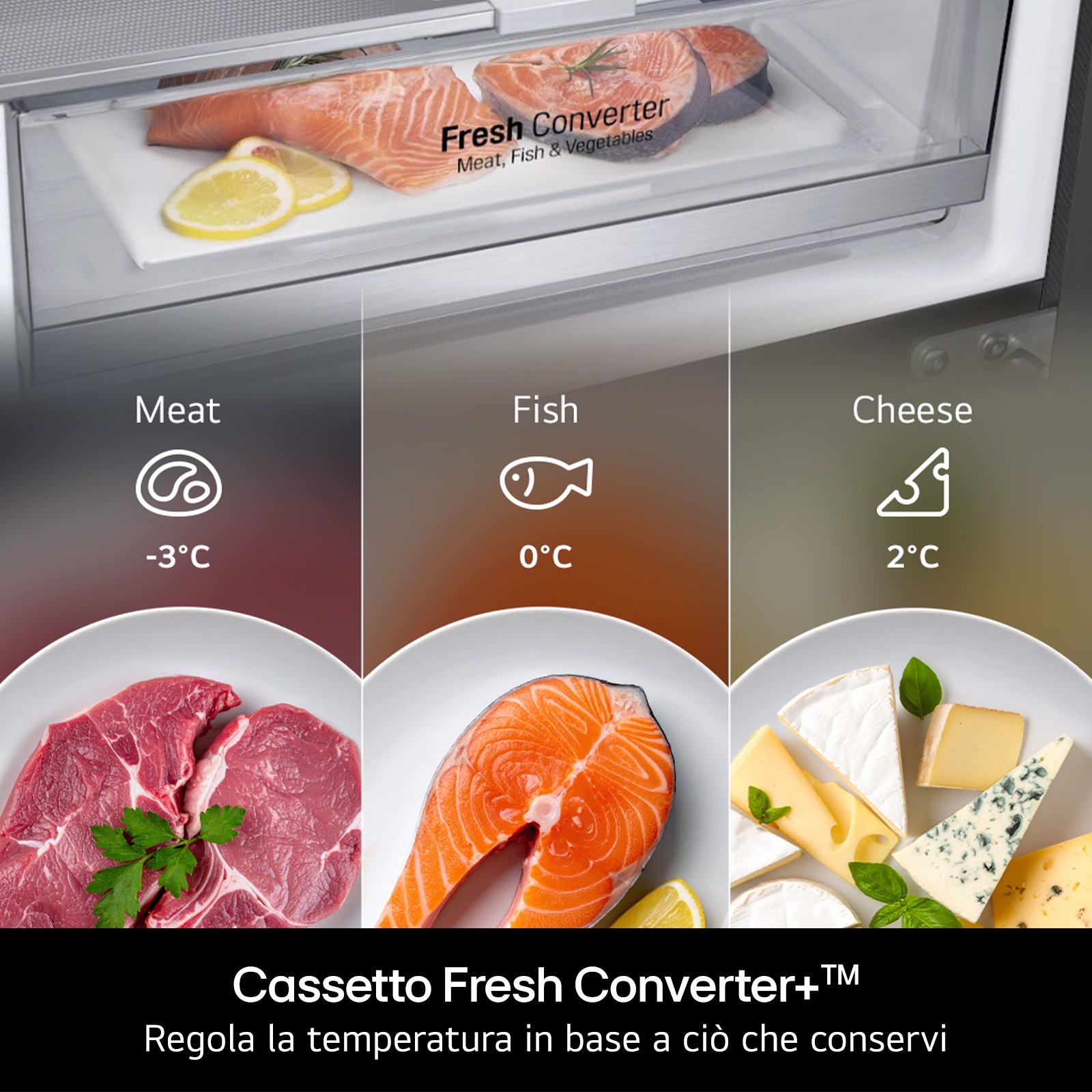Ottieni il massimo controllo sulla conservazione dei tuoi alimenti grazie ai cassetti del frigo. Il FRESH Balancer™ ti permette di regolare l’umidità del cassetto frutta & verdura, scegliendo facilmente tra due modalità dedicate. Il cassetto Zero Gradi con FRESH Converter™, consente di impostare la temperatura ottimale per carne o pesce fresco, oppure trasformarlo in uno spazio frigo tradizionale, garantendo flessibilità e organizzazione perfetta.
