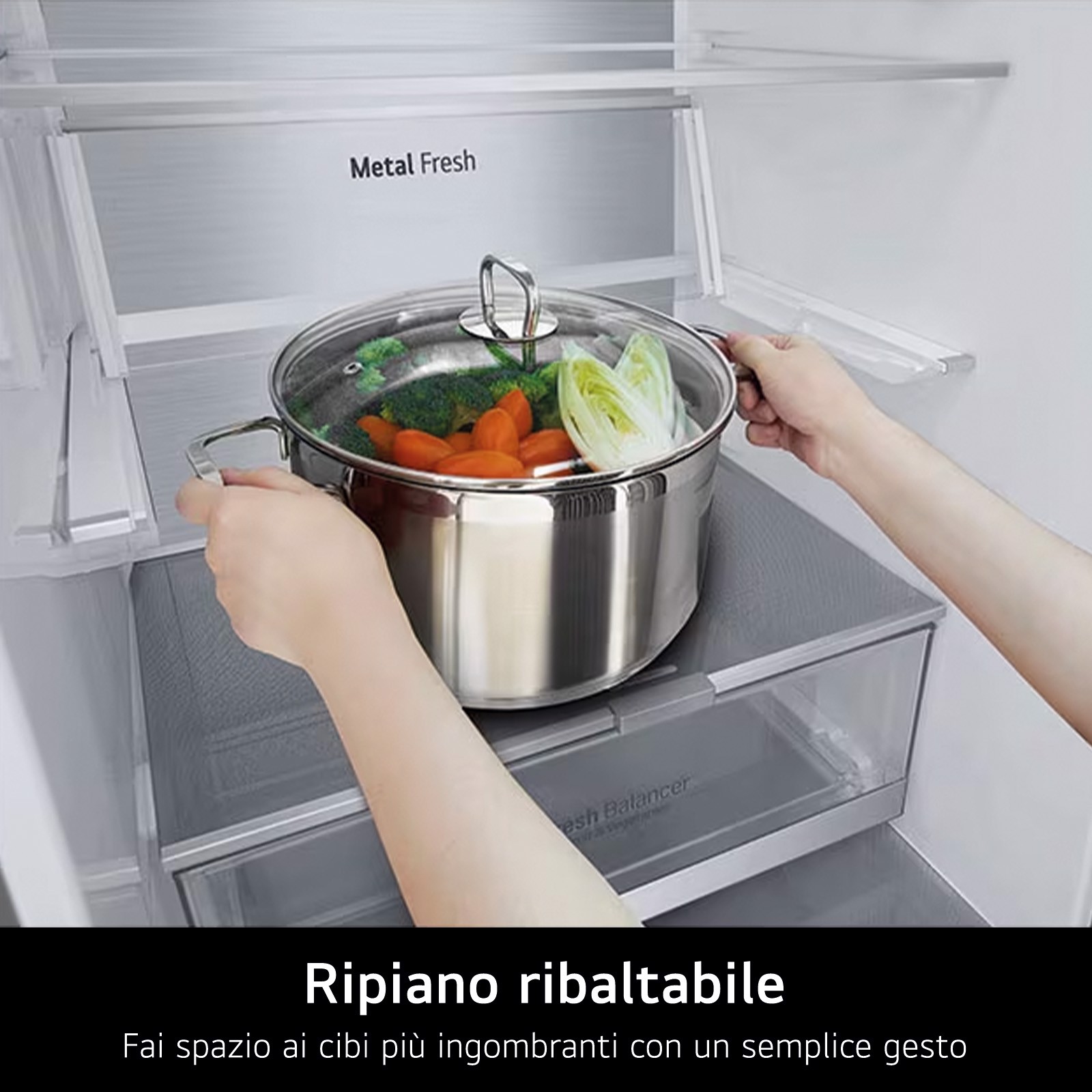Quando devi conservare delle pietanze ingombranti - ad esempio una pentola, o un'anguria - non dovrai più rimuovere o spostare i ripiani per fare spazio nel frigorifero. Ti basterà un gesto per ritrarre e per ribaltare il ripiano, in modo da ampliare lo spazio a disposizione e riporre ciò che vuoi senza fatica."