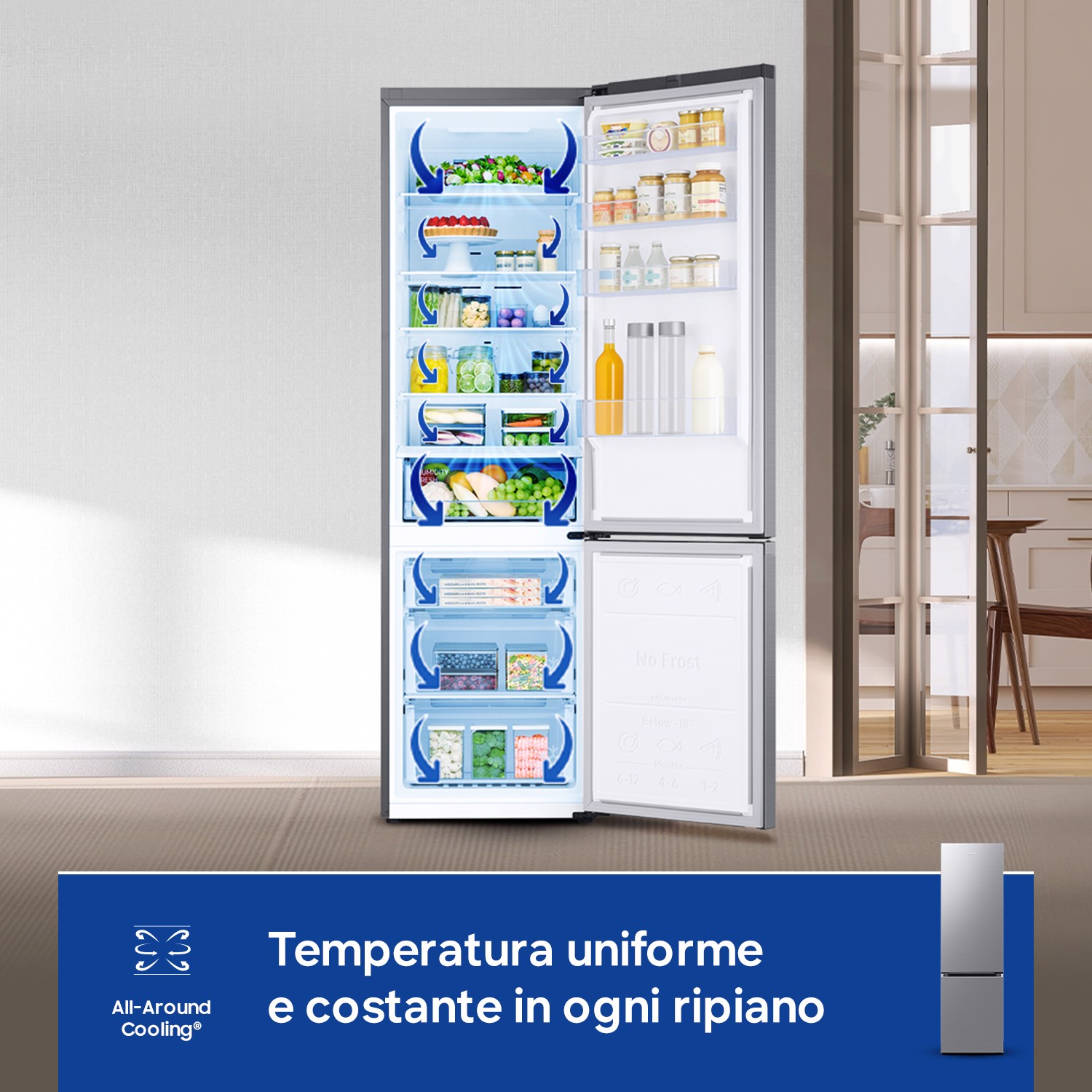 Assicurati che tutti i tuoi alimenti siano adeguatamente refrigerati. Il sistema All-Around Cooling garantisce un freddo uniforme in ogni zona del frigorifero. Controlla costantemente la temperatura e fa circolare laria fredda attraverso bocchette collocate in posizioni strategiche. In questo modo ogni prodotto viene conservato alla temperatura ideale e rimane fresco più a lungo.
