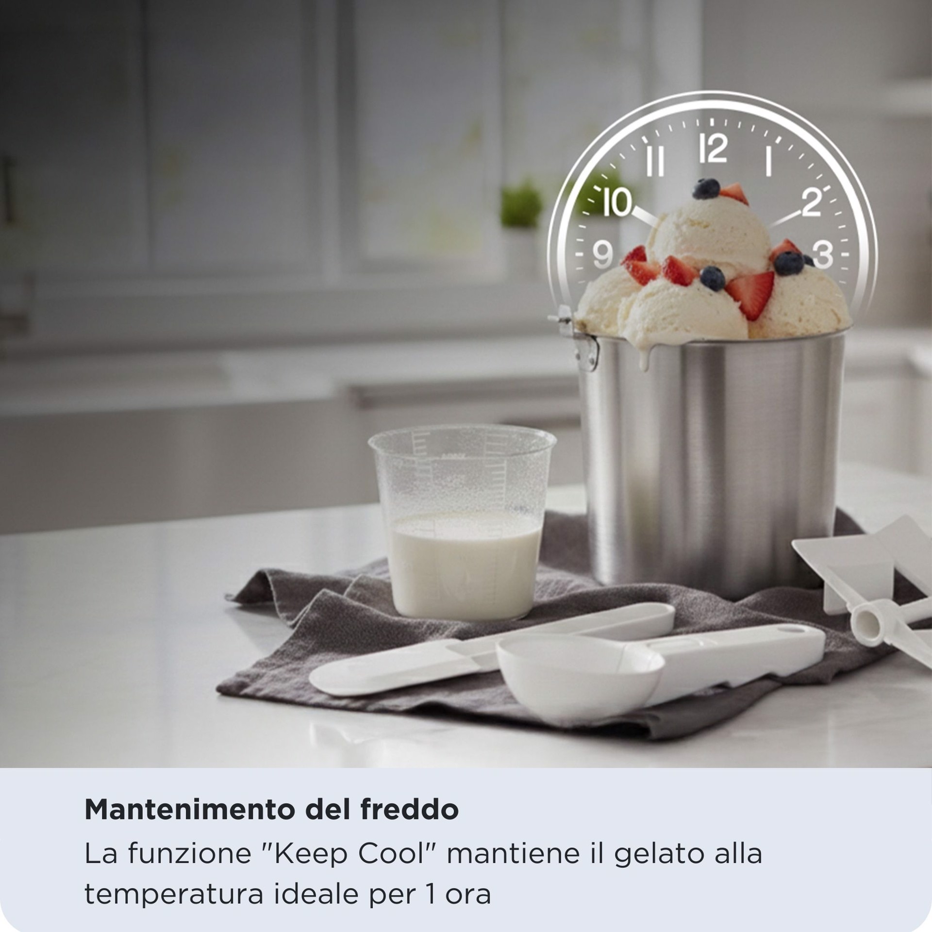 Gran Gelato 4in1 è la gelatiera auto refrigerante e l'alleata perfetta per chi ama i dessert freschi e genuini ma non vuole complicazioni. Grazie al compressore integrato, dimentica di dover pre-congelare il cestello in freezer per ore: questa macchina è sempre pronta all'uso per soddisfare la tua voglia di dolce in pochi minuti.Dotata di un design elegante e compatto, si adatta perfettamente a qualsiasi cucina moderna, offrendo prestazioni professionali con un utilizzo intuitivo. La tecnologia auto refrigerante con compressore silenzioso integrato permette di non utilizzare ghiaccio né pre-congelamento: la gelatiera raffredda autonomamente e congela gli ingredienti mentre mescola, garantendo una consistenza cremosa e perfetta.Gran Gelato 4in1 ha una versatilità 4-in-1 grazie all'ampia varietà di programmi, puoi preparare ogni giorno qualcosa di diverso:Gelato classico cremoso.Yogurt leggero naturale e salutare.Sorbetto fresco alla frutta.Slush (Granita) dissetante e golosaGrazie alla funzione “keep cool” il gelato viene mantenuto alla temperatura ideale per 1 ora dopo la fine della preparazione, evitando che si sciolga.Progettata per la massima igiene e praticità, il cestello è rimovibile, così come tutti gli accessori (spatola, misurino e cucchiaio inclusi), rendendo le operazioni di pulizia semplici e veloci.