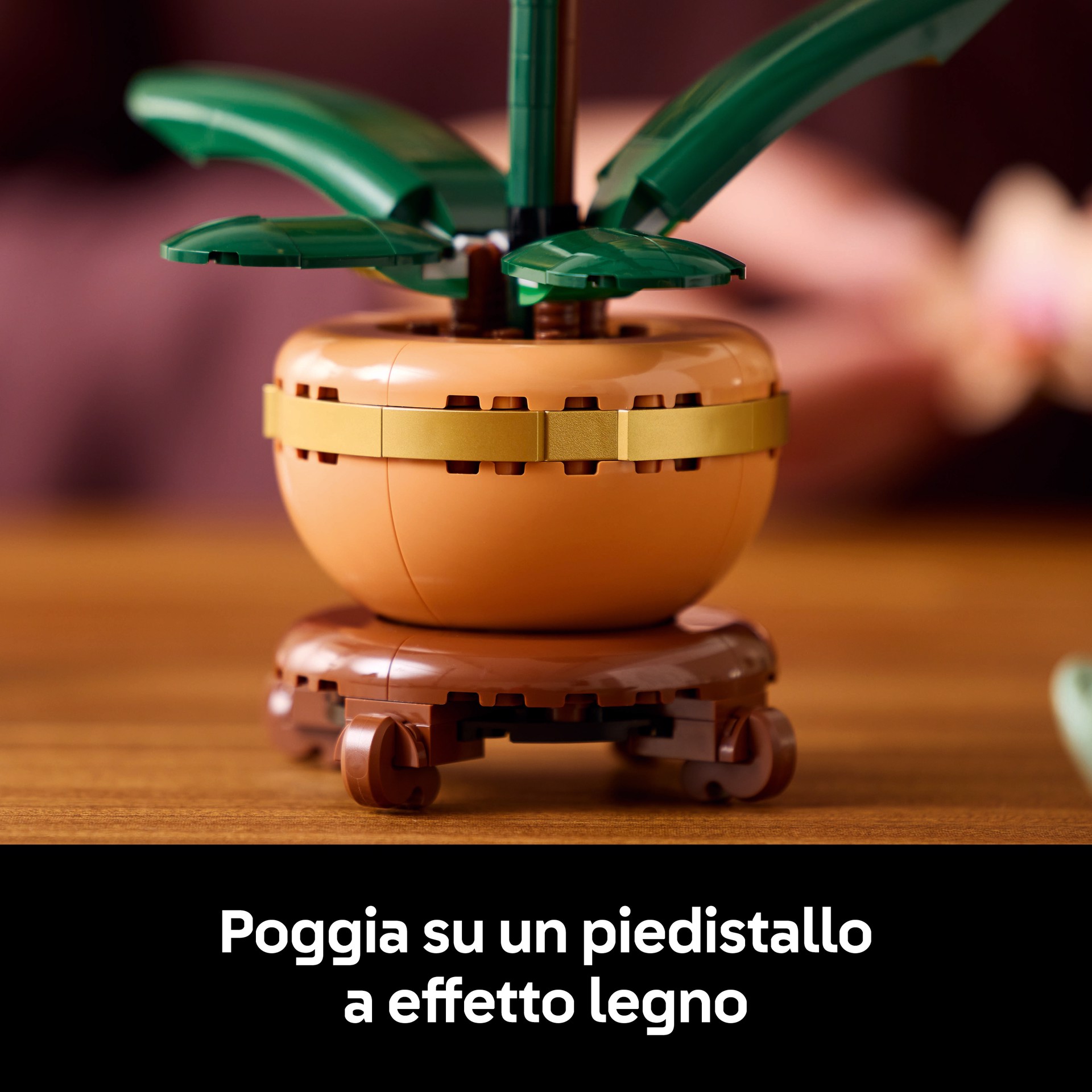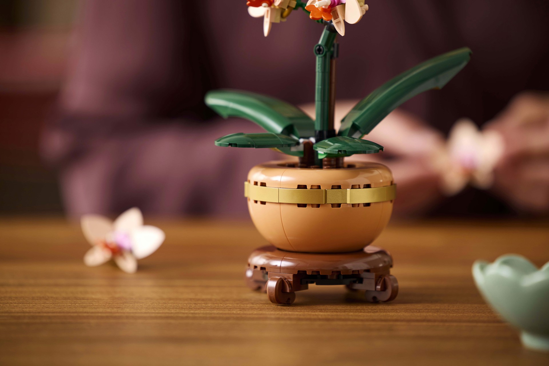 La replica realistica presenta 5 fiori di orchidea in fiore e alcuni in bocciolo, oltre a foglie per tanta autenticità in più. Contiene inoltre un vaso da fiori color pesca posizionato su uno splendido piedistallo effetto legno, facilitando l’esposizione del fiore LEGO da parte dei fioristi in erba che potranno così portare tanta tranquillità naturale in qualsiasi spazio di vita o di lavoro.