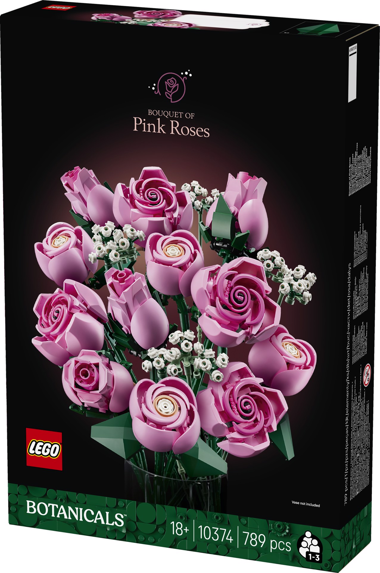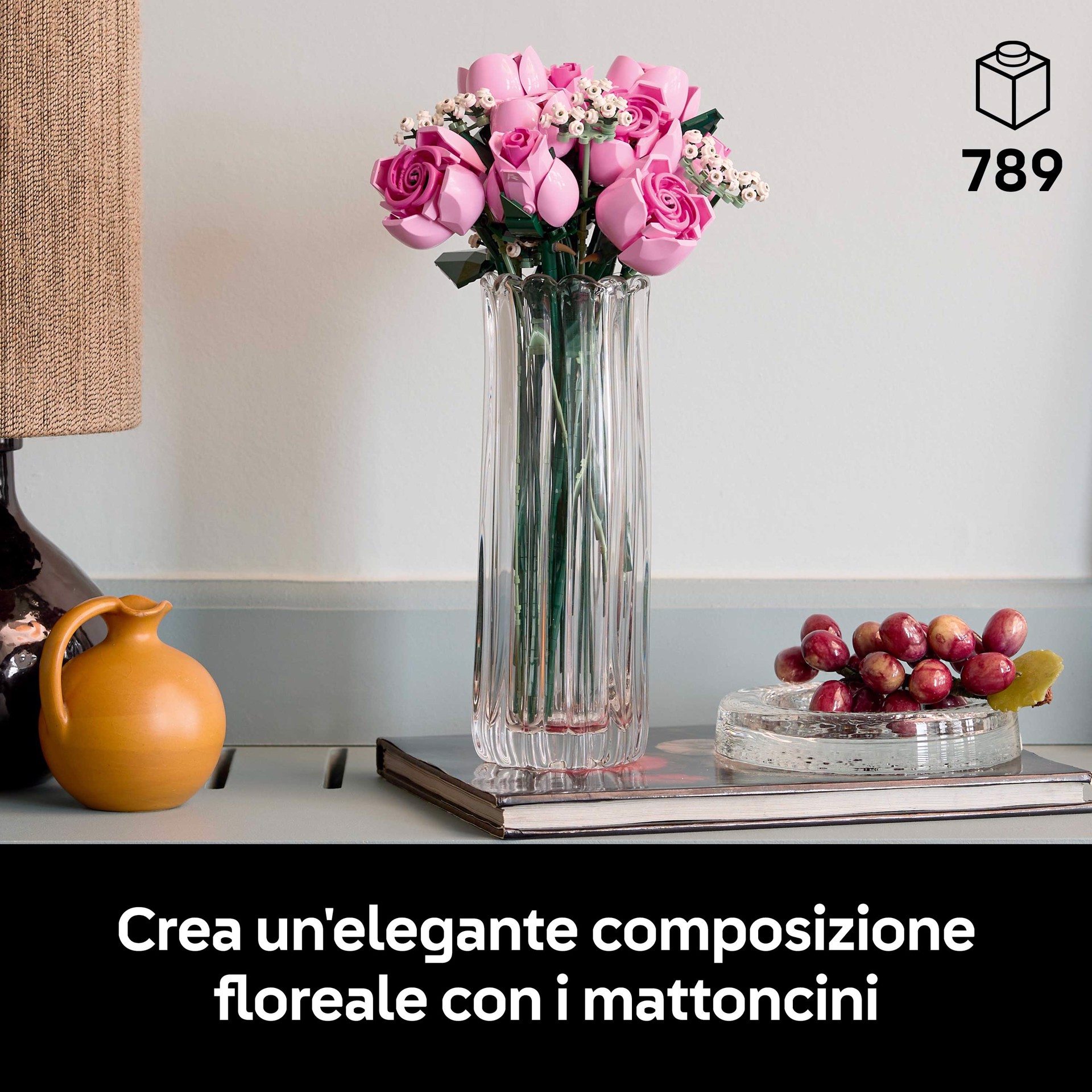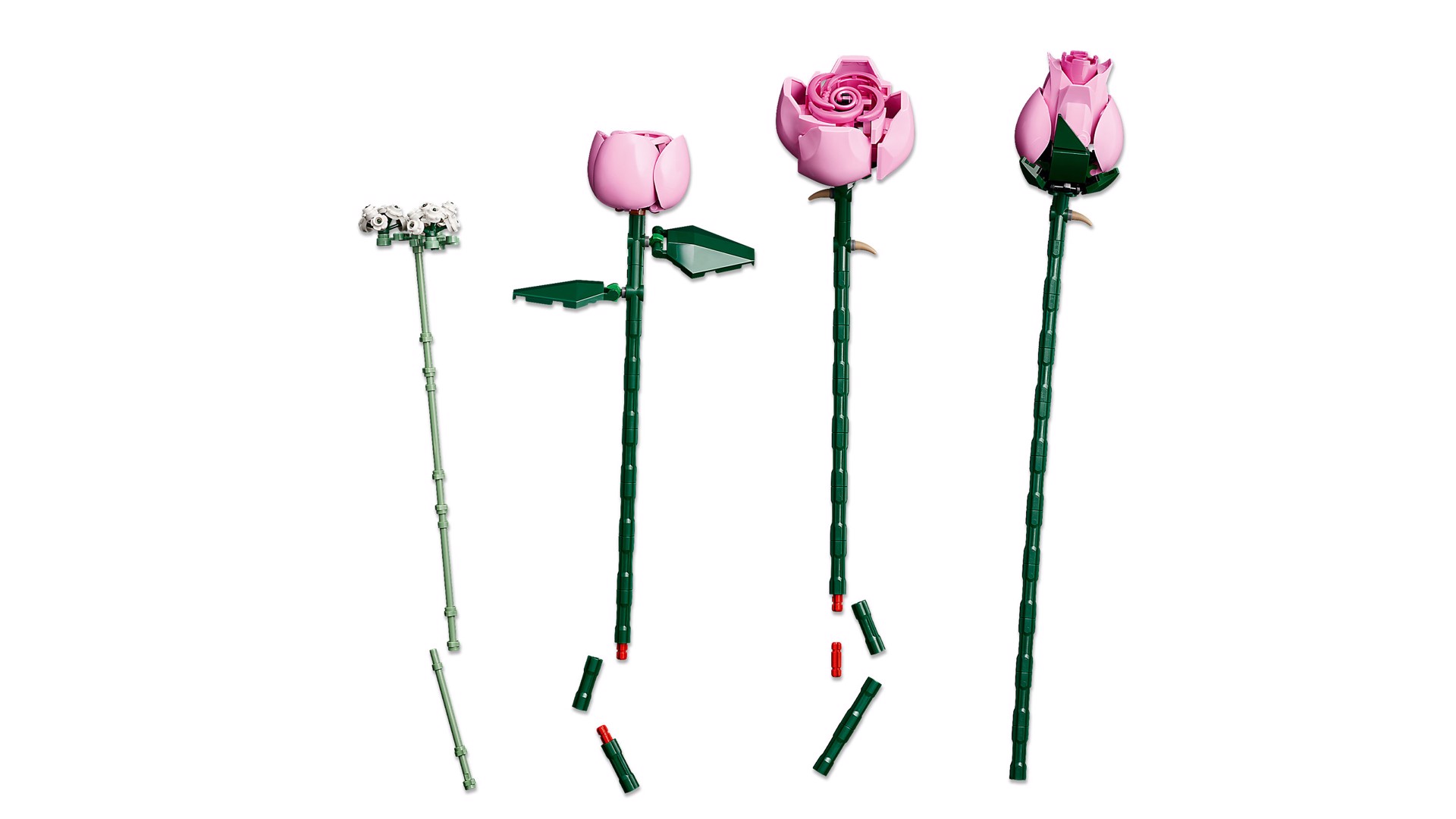 Fiori LEGO®: il set presenta 4 rose in piena fioritura, 4 rose in fiore e 4 boccioli di rosa, oltre a 4 rametti di gipsofila con fiori bianchi