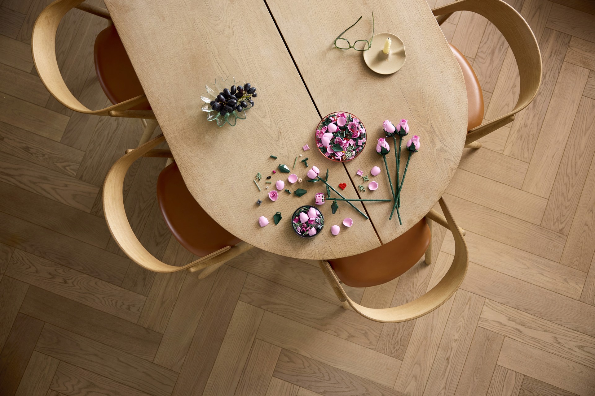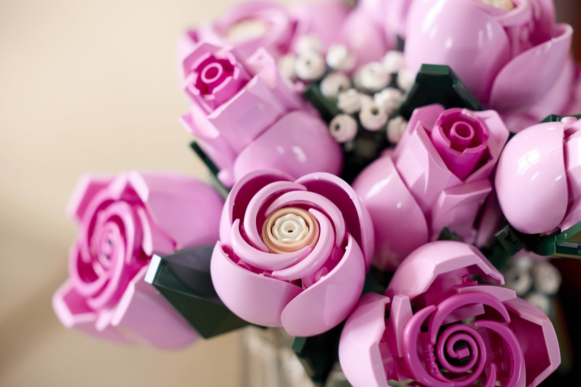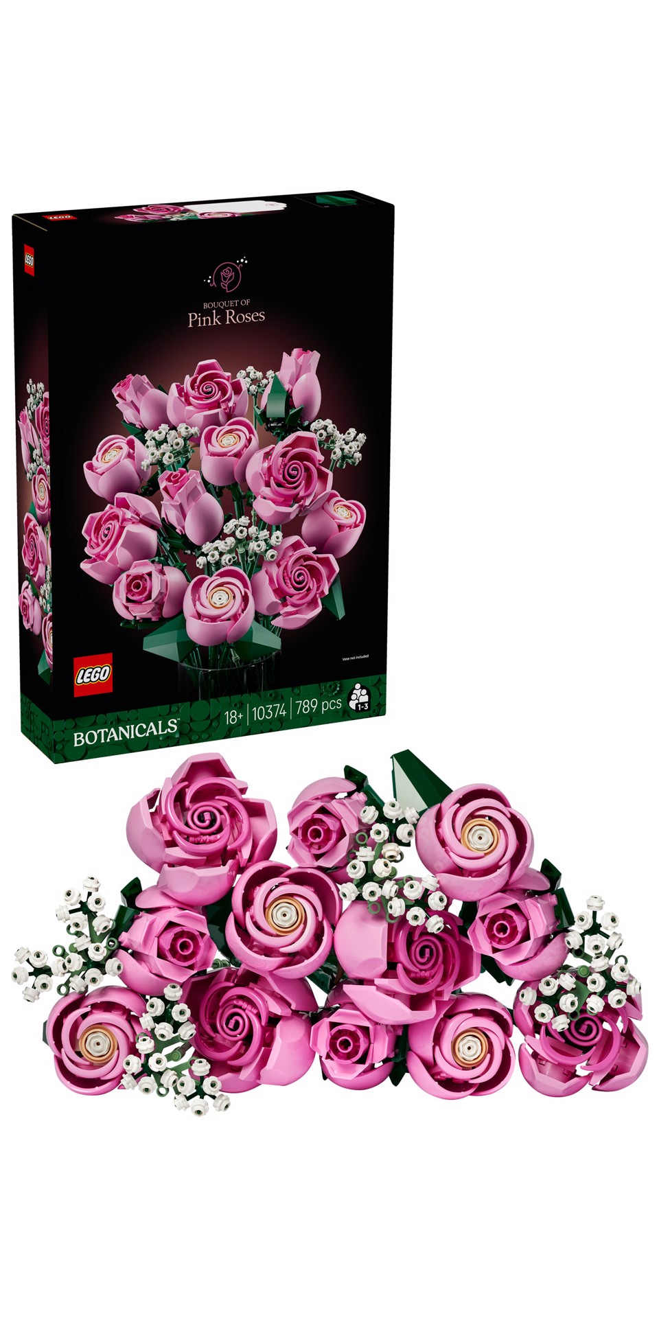 Fiori LEGO®: il set presenta 4 rose in piena fioritura, 4 rose in fiore e 4 boccioli di rosa, oltre a 4 rametti di gipsofila con fiori bianchi