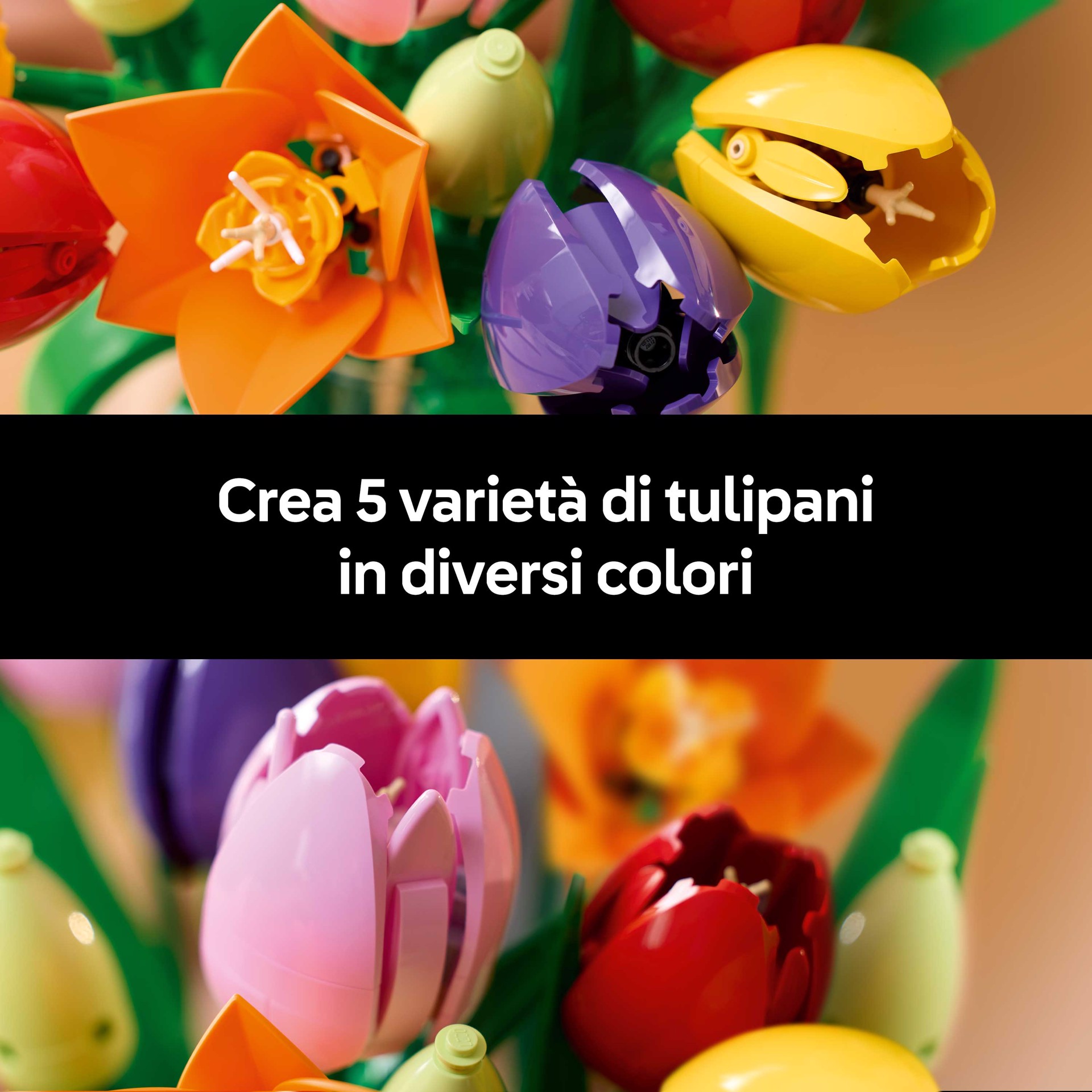5 TULIPANI LEGO®: il bouquet include 5 varietà di tulipani in vari colori e fasi di fioritura; ci sono boccioli verdi, tulipani viola chiusi e tulipani rossi, gialli, rosa e arancioni aperti