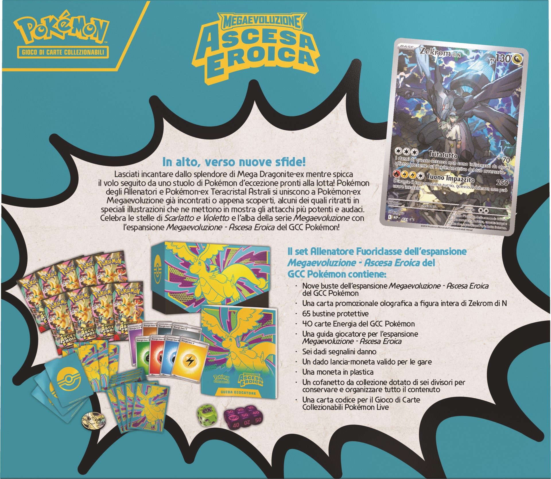 Il set Allenatore Fuoriclasse dell'espansione Megaevoluzione - Ascesa Eroica del GCC Pokémon contiene: