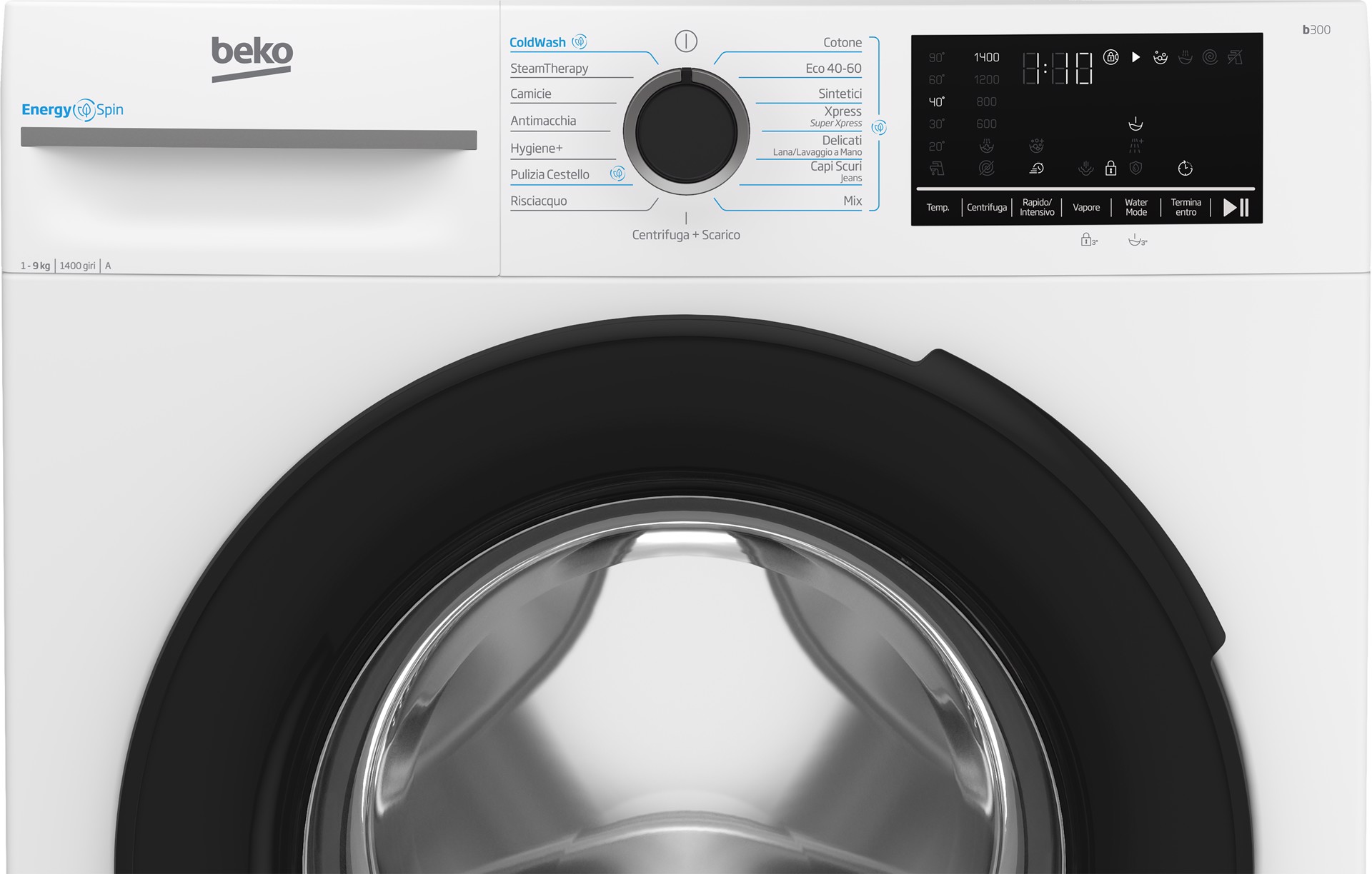 BEKO b300 BMW9149DB Lavatrice 9kg, Classe A-30%, Bianco, Motore Inverter 1400giri, Display touch, Porta nera, EnergySpin™, Vapore