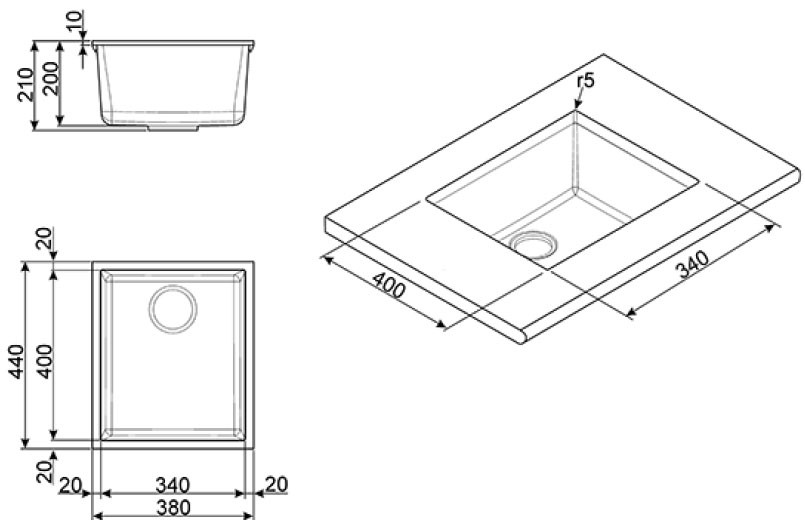 - dotazione: troppopieno, piletta 3.5”, guarnizioni, morsetti di fissaggio e sifone con attacco lavastoviglie.