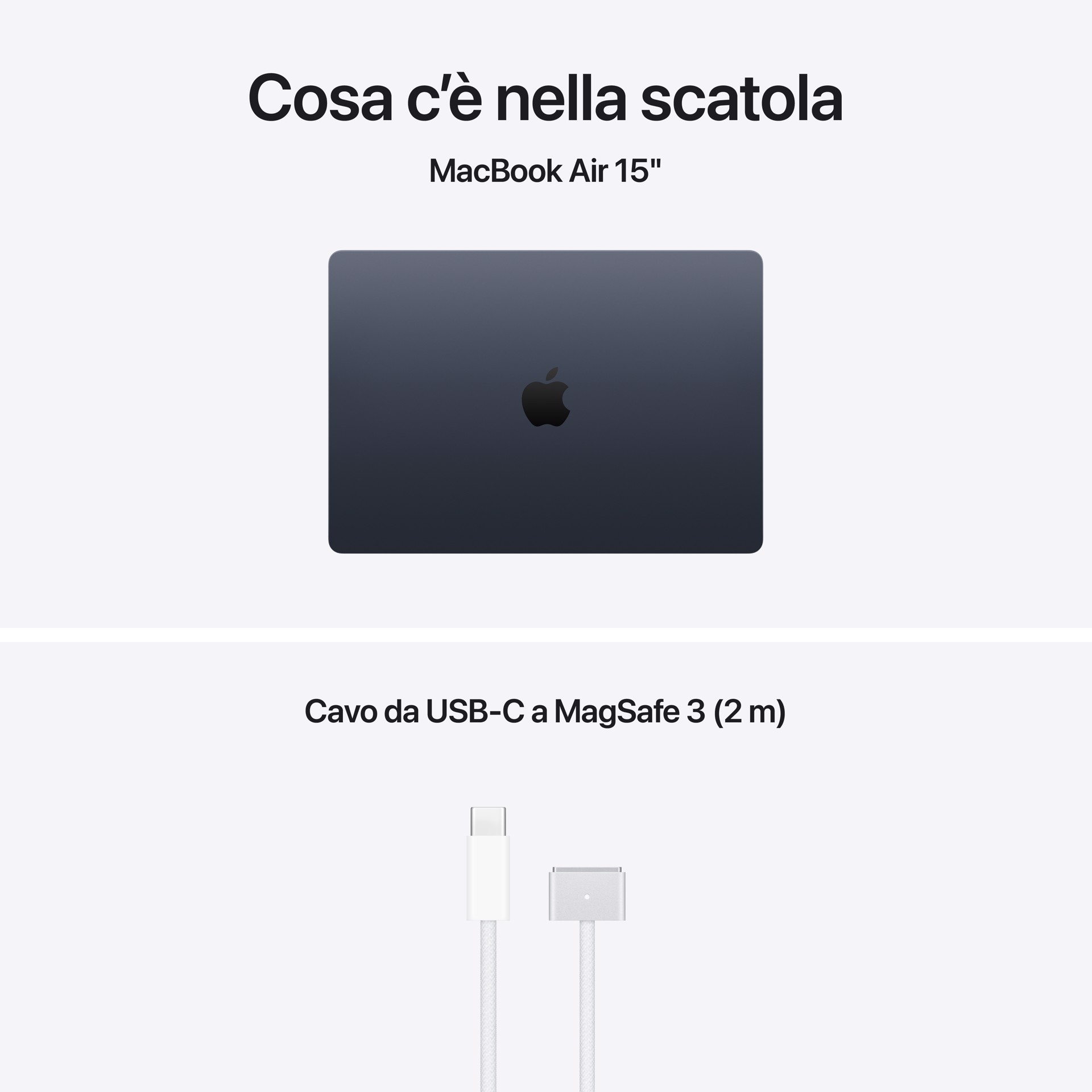 - ALIMENTATORI – N.B. MacBook Air (15") include un cavo di ricarica da USB C a MagSafe 3 senza alimentatore. Per ricaricare questo dispositivo è necessario un alimentatore USB C o un’altra fonte di alimentazione USB PD da almeno 35W. Per una ricarica ottimale, Apple consiglia l’alimentatore Apple da 35W a doppia porta USB C, oppure l’alimentatore USB C Apple da 70W per sfruttare la ricarica rapida (fino al 50% di carica in 35 minuti).