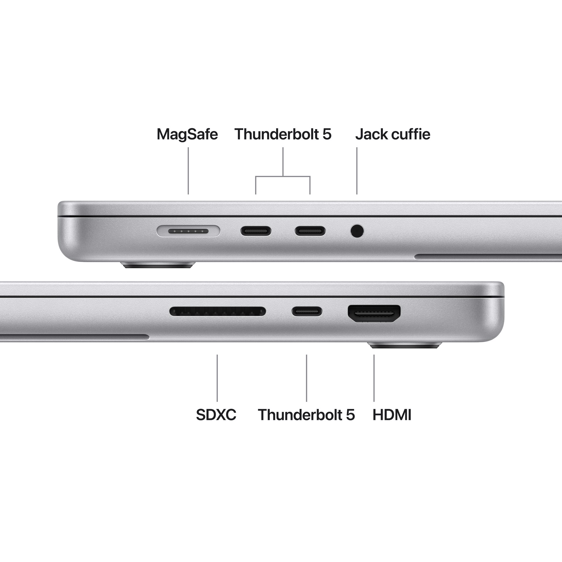 - SI CONNETTE A TUTTO — Ha tre porte Thunderbolt 5, una porta di ricarica MagSafe 3, uno slot SDXC card, una porta HDMI, un jack per cuffie e il chip wireless N1 progettato da Apple per le tecnologie Wi Fi 7e Bluetooth 6. E con il chip M5 Pro puoi collegare fino a tre monitor esterni, che diventano quattro con il chip M5 Max.