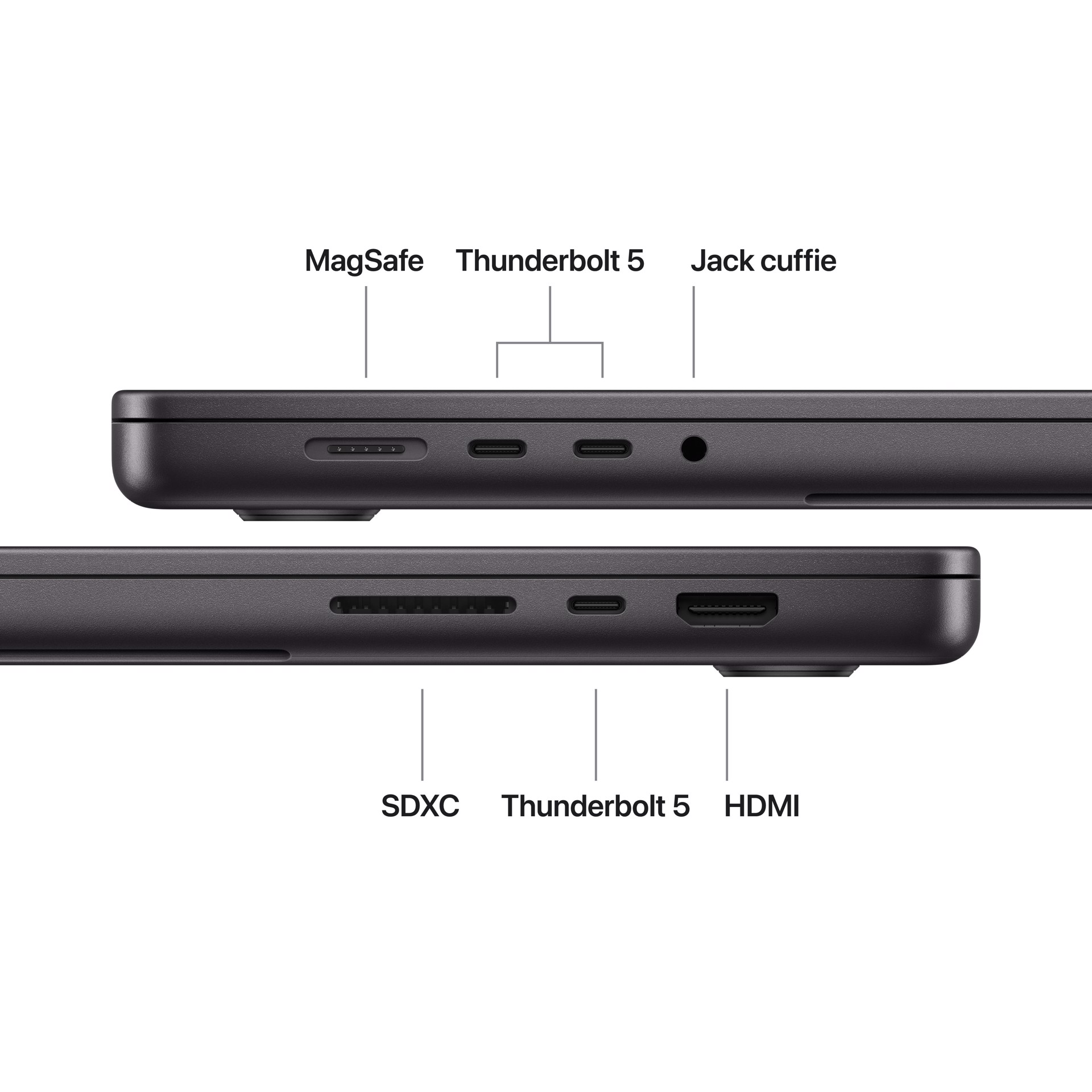- SI CONNETTE A TUTTO — Ha tre porte Thunderbolt 5, una porta di ricarica MagSafe 3, uno slot SDXC card, una porta HDMI, un jack per cuffie e il chip wireless N1 progettato da Apple per le tecnologie Wi Fi 7e Bluetooth 6. E con il chip M5 Pro puoi collegare fino a tre monitor esterni, che diventano quattro con il chip M5 Max.