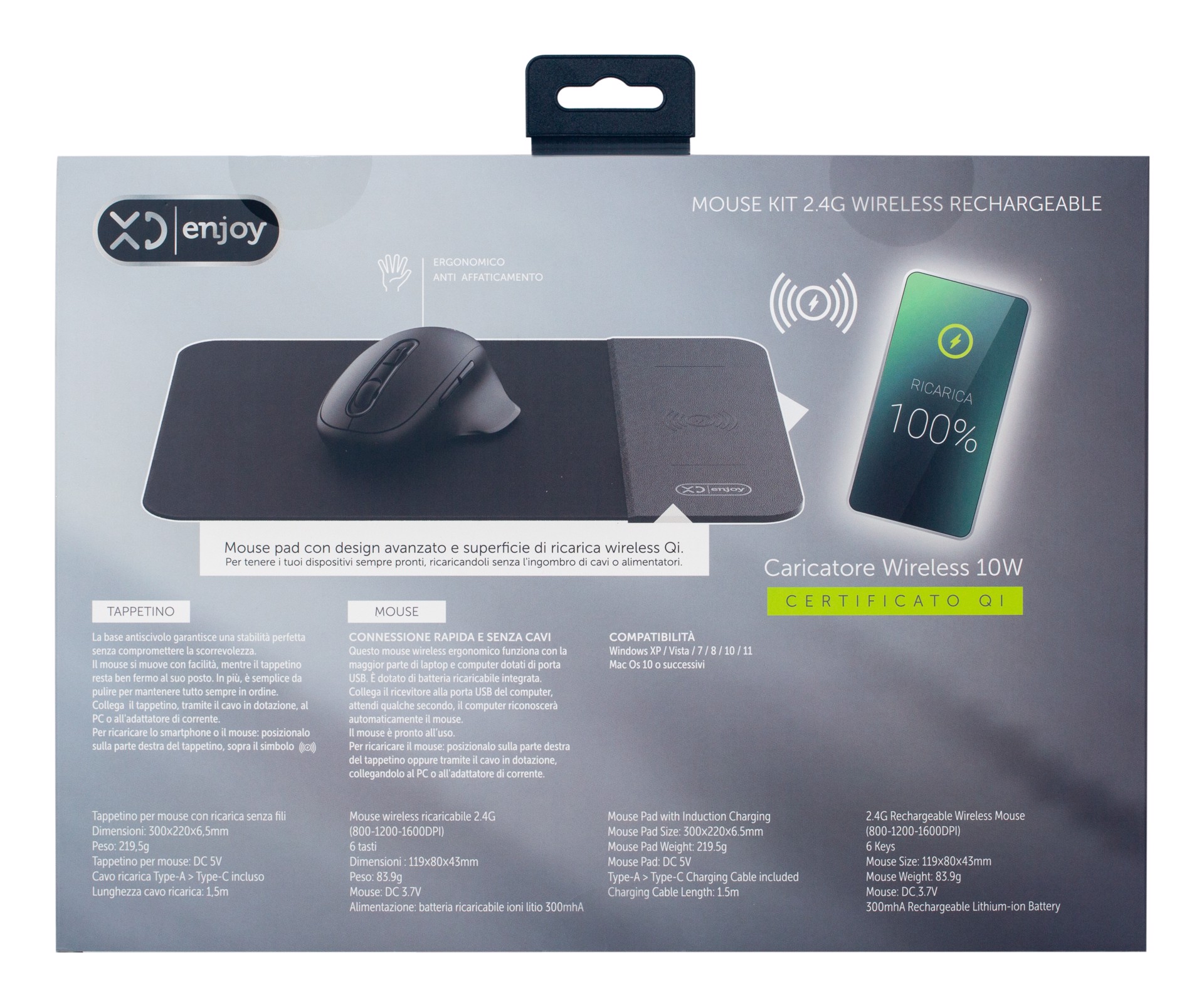 Questo mouse wireless ergonomico funziona con la maggior parte di laptop e computer dotati di porta USB. È dotato di batteria ricaricabile integrata. Collega il ricevitore alla porta USB del computer, attendi qualche secondo, il computer riconoscerà automaticamente il mouse. Il mouse è pronto all’uso. Per ricaricare il mouse: posizionalo sulla parte destra del tappetino oppure tramite il cavo in dotazione, collegandolo al PC o all'adattatore di corrente.