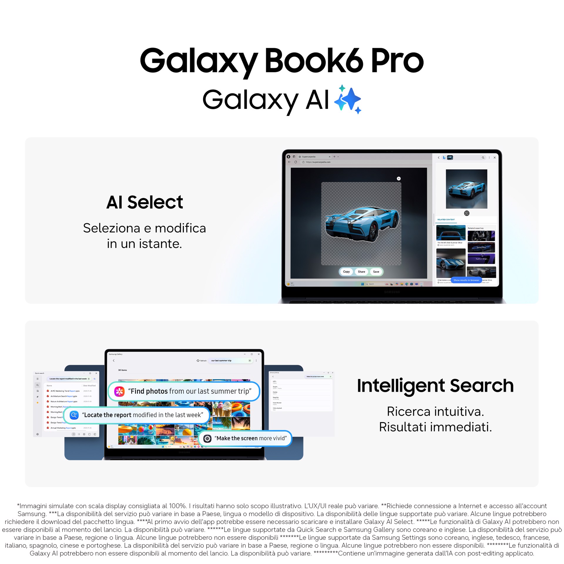Galaxy Book6 Pro offre prestazioni avanzate pensate per l’era dell’intelligenza artificiale. Il nuovo processore Intel® Core™ Ultra Serie 3 assicura velocità ed efficienza energetica superiori, supportato da un sistema di raffreddamento evoluto che mantiene temperature stabili e una rumorosità contenuta anche sotto carico. L’autonomia è uno dei suoi punti di forza: fino a 30 ore di riproduzione video su entrambi i formati da 14 e 16 pollici, grazie anche al refresh rate adattivo da 30 a 120 Hz che ottimizza i consumi. Il display Dynamic AMOLED 2X offre immagini estremamente luminose, contrastate e ricche di dettagli, adattandosi alle condizioni di luce con l’Advanced Vision Booster e offrendo un’interazione naturale grazie al supporto touch. Il design, sottile e leggero, con corpo in metallo premium, una tastiera ridisegnata e un touchpad aptico centrale, esprime equilibrio e funzionalità. Le funzionalità Galaxy AI completano l’esperienza, rendendo la gestione di contenuti, immagini e impostazioni più intuitiva e immediata.