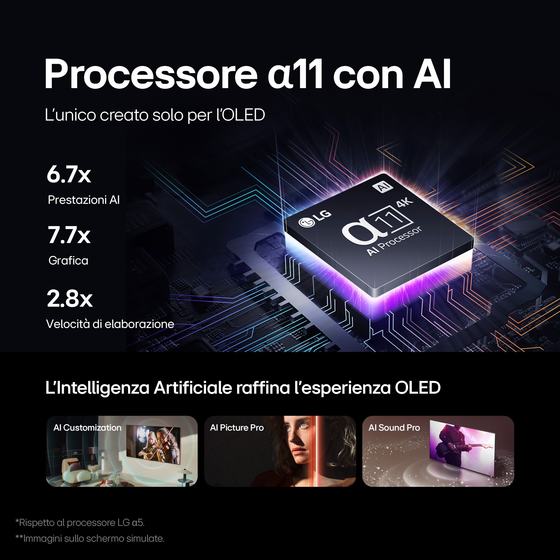 Concepito mettendo a frutto l'esperienza ultra-decennale di LG nel campo OLED, questo processore sfrutta l'Intelligenza Artificiale per raffinare immagini e suoni, rendendoli ancora più coinvolgenti. È l'unico processore progettato specificamente per i TV OLED, capace di trarre il meglio da questa tecnologia. Ed è anche il più potente mai creato da LG: prestazioni AI più veloci di 6,7 volte, grafica più potente di 7,7 volte e 2,8 volte più veloce rispetto al processore α5 di LG.