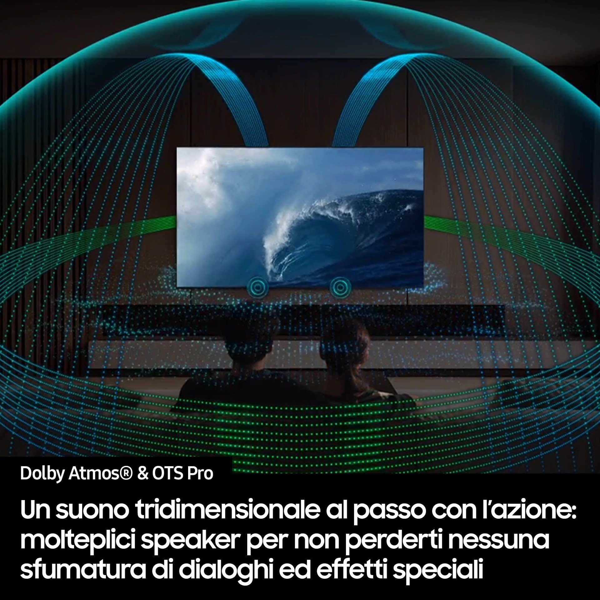 Vivi ogni scena con la massima intensità. Gli altoparlanti a canale superiore di Samsung e la tecnologia Dolby Atmos creano una cupola sonora multidimensionale incredibilmente avvolgente, per un'esperienza audio davvero intensa.