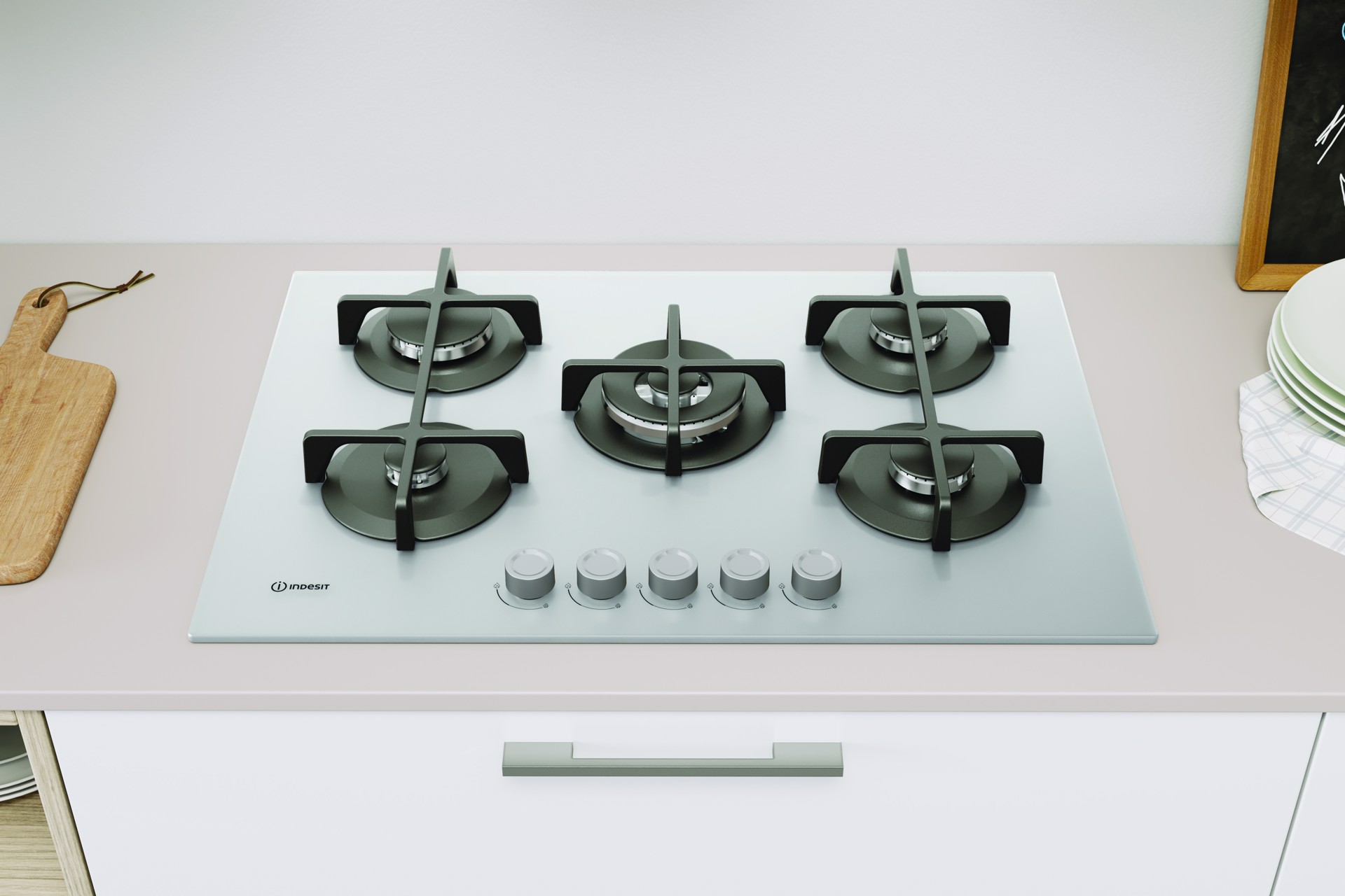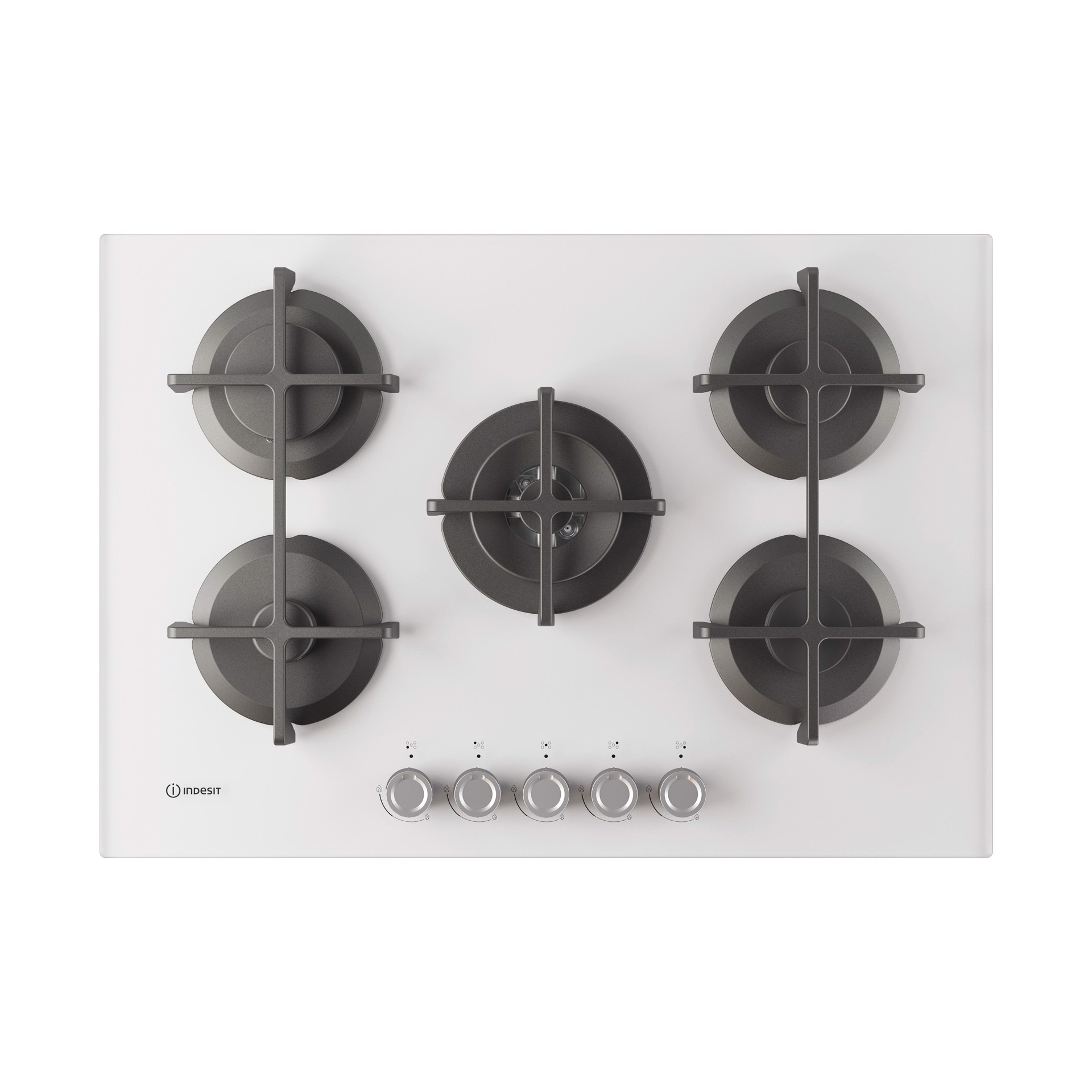 INDESIT ING 72T/WH 1 piano gas vetro bianco 75cm 5 fuochi bruciatore doppia corona griglie in ghisa lavabili in lavastoviglie