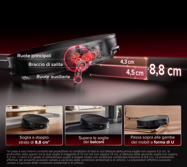 Roborock Saros 20X è progettato per adattarsi a qualsiasi ambiente domestico. Il nuovo telaio AdaptiLift® 3.0 supera le soglie di 4,5 + 4,3 cm. Il sistema autonomo StarSight 2.0 consente una mappatura più rapida, un posizionamento più preciso, un riconoscimento degli ostacoli più accurato e lo spostamento in spazi più bassi. Grazie alla sua tripla struttura sollevabile, al doppio sistema anti-groviglio e alla nuovissima RockDock®, la pulizia intelligente e senza sforzo diventa un gioco da ragazzi.