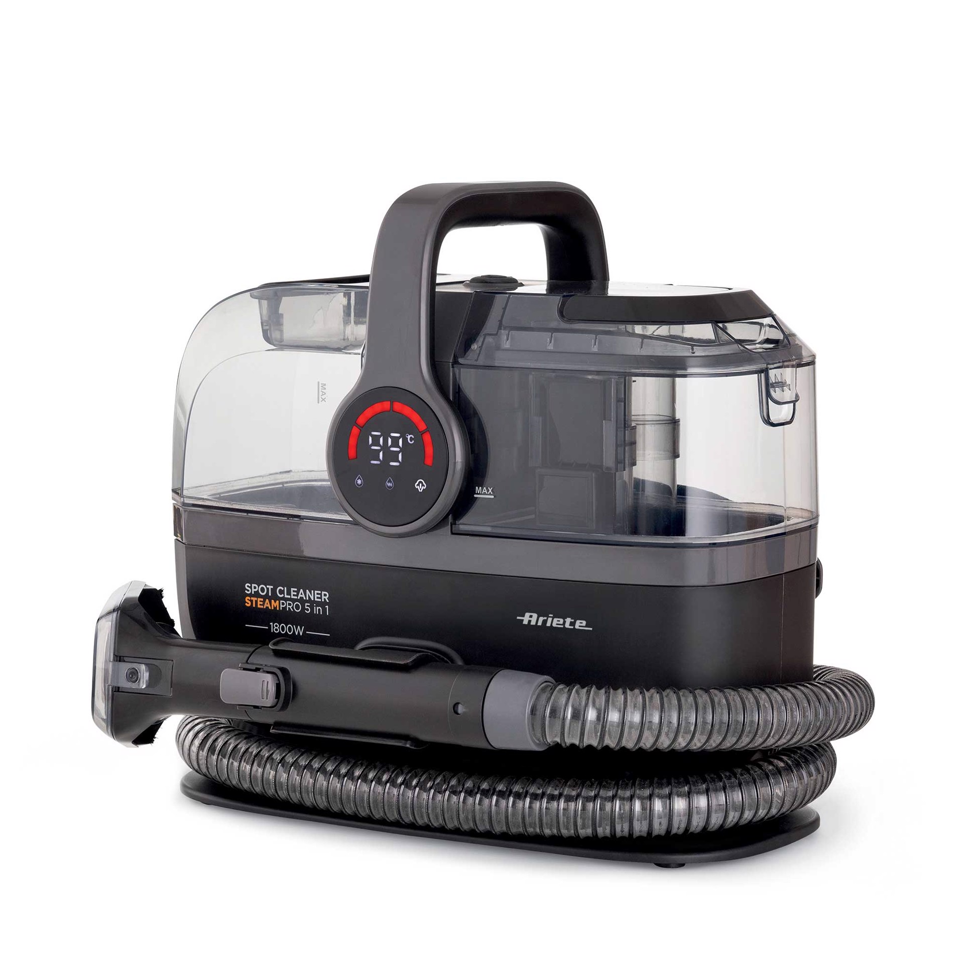 ARIETE 2484 Spot Cleaner Steam PRO 5in1, Lavatappeti e pulitore a vapore, Elimina macchie da interni Auto, Divani, Moquette, Materassi, tappeti, 1800W, 3 modalita di pulizia, Elevata potenza aspirante, Pet care, 2 serbatoi