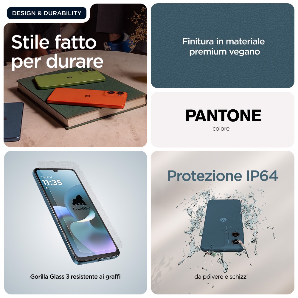 Ecco moto g06, un telefono progettato per andare oltre le tue aspettative. Guarda i tuoi programmi e film preferiti su un ampio e luminoso display 6,88", il nostro più grande di sempre su moto g, con altoparlanti stereo e audio Dolby Atmos®. Scatta foto straordinarie con qualsiasi condizione di luce utilizzando un sistema di fotocamere da 50 MP con tecnologia AI.(1) Ottieni multitasking super efficiente con fino a 24 GB di RAM utilizzando RAM Boost.(2,5,6,10) Goditi la tranquillità grazie alle caratteristiche di resistenza avanzata e a un design premium, che include la protezione dall'acqua IP64(3), Corning® Gorilla® Glass 3 e finitura in materiale premium vegano. Goditi 2 giorni con una singola ricarica.(4) E vivi esperienze Moto esclusive che rendono il tuo telefono più sicuro, personale e divertente. Inoltre, cerca immediatamente tutto ciò che vedi sul tuo telefono con Cerchia per cercare. Ottieni di più con moto g06.