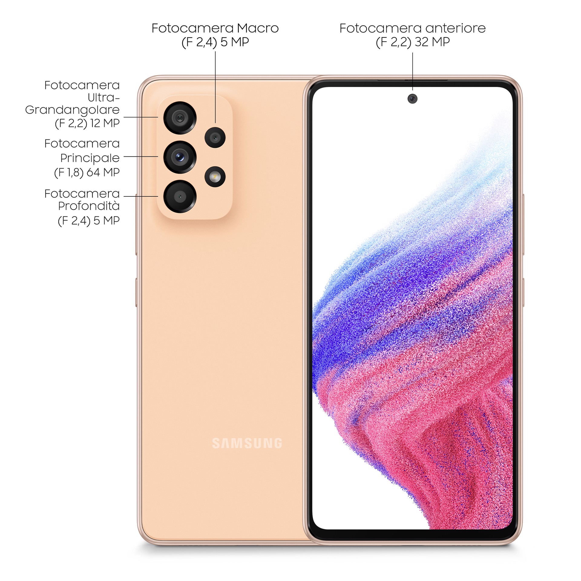 Galaxy A53 5G Display 6.5” FHD+ Super AMOLED Doppia SIM Android 12, RAM 6 GB, 128 GB, 5.000 mAh, Awesome Peach, 16,5 cm (6.5"), 6 GB, 128 GB, 64 MP, Android 12, Pesca