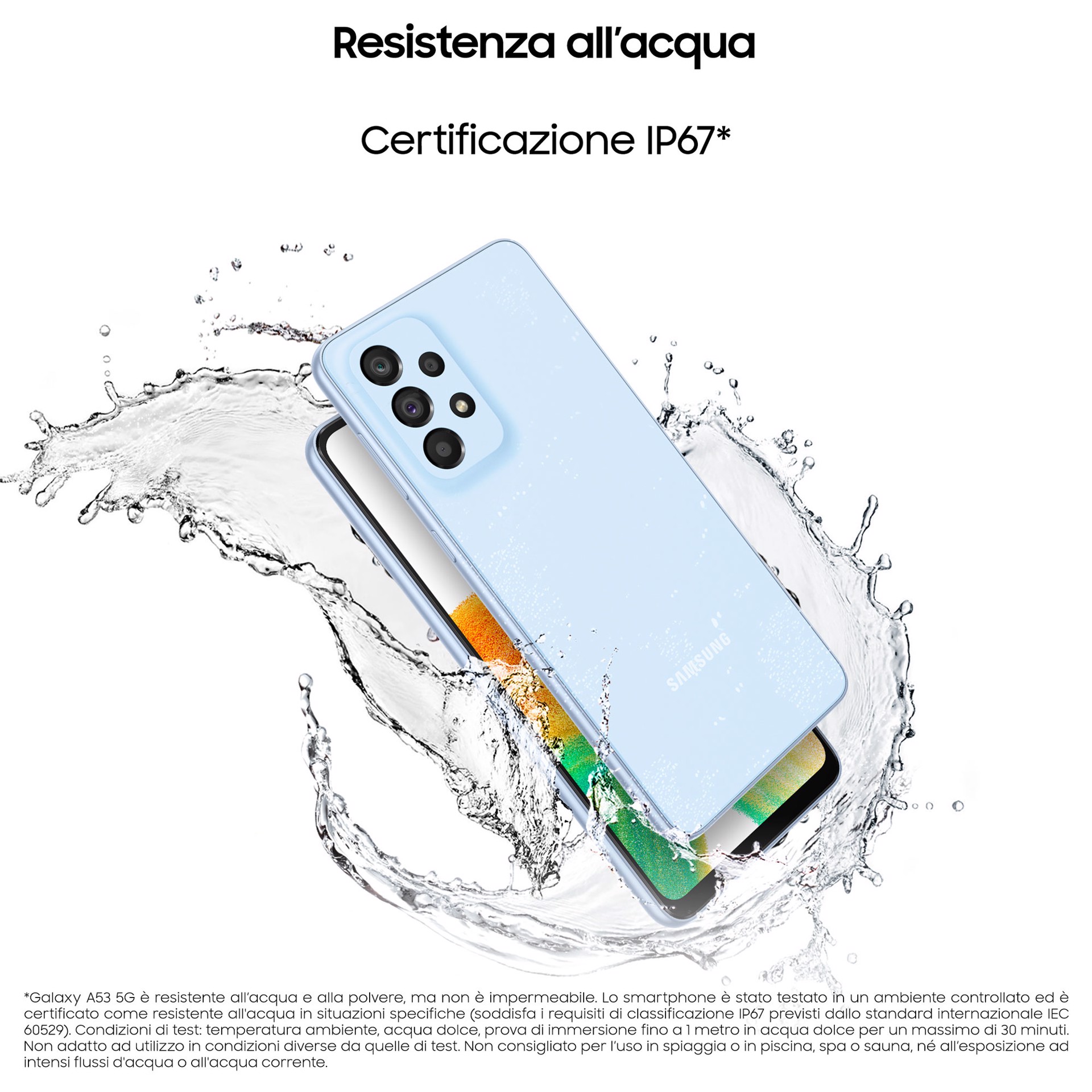 Certificato IP67, Galaxy A53 5G resiste all'acqua e alla polvere e può rimanere immerso a 1 metro di profondità per 30 minuti.¹ Con l’ulteriore protezione Gorilla Glass 5, il tuo dispositivo è ora più resistente e meno incline ai graffi.